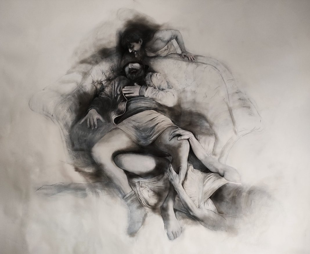La sua poetica si muove dall’archetipo per accarezzare l’uomo. Lo fa nelle linee di grafite e carboncino, negli sfumati a cui sottrae materia cancellando, come se fosse la gomma il suo scalpello. E poi pochi dettagli dipinti, la pittura come se fosse ricamo, gioiello.