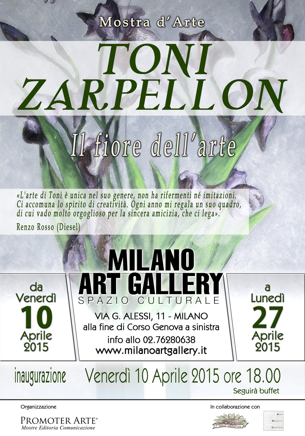 Il rinomato maestro Toni Zarpellon sta per inaugurare la prestigiosa mostra dal titolo "Il fiore dell'arte" allestita nello storico spazio milanese della Milano Art Gallery, in via Alessi 11, con l'organizzazione del manager della cultura Salvo Nugnes, che si terrà dal 10 al 27 Aprile 2015. L'evento inaugurale è fissato per Venerdì 10 Aprile alle ore 18.00.