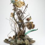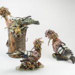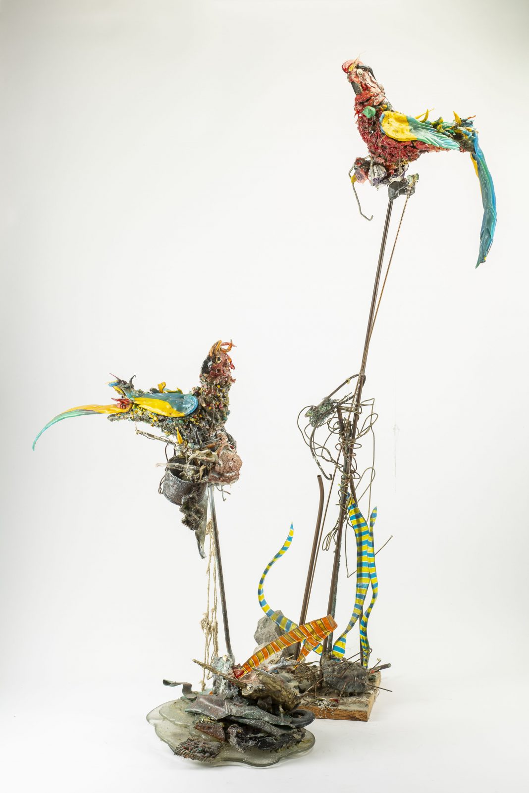 Si tratta di pezzi sperimentali che l’artista realizzava con scarti di vetro, avanzi di fornace assemblati con materiali organici, lamiere, stagnole, spaghi, cera, turaccioli e rappresentano un corpus di animali di diverse specie, sia selvatici che da cortile e da compagnia. Per un periodo determinato (la durata della mostra) upupe, gufi, civette, martin pescatori, galli, galline prenderanno letteralmente possesso degli spazi della galleria.