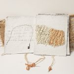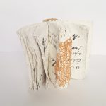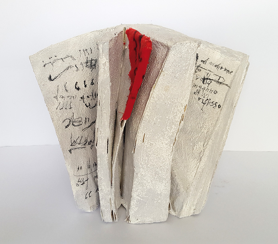 Questo necessario preambolo serve a calarci nella produzione di Tonia, in cui il supporto che rimanda al libro racconta le fantastiche risonanze della pittura, permettendo però che le parole indietreggino per lasciare, su ogni pagina, l’impronta della tessitura dell’anima. Le scritture “multicodice” di Tonia vogliono costruire infatti un dialogo ricco ma assolutamente intimo con chi ne accoglie lo spessore e la ricchezza: la parola vi si addensa in messaggi in cui si incrociano echi della poesia visiva e linguaggi oggettivamente diversi, come quello aniconico: i suoi libri oggetto si muovono oltre la dimensione quotidiana del linguaggio, superano le strettoie semantiche e sintattiche, che inevitabilmente caratterizzano la comunicazione denotativa quotidiana. Questo speciale livello comunicativo è il frutto di un raffinato lavoro di ricerca che si muove nel gran mare della contemporaneità: per questo i libri di Tonia “materializzano” la parola restituendo, allo stesso tempo, quello che, di per sé, è insito nella parola, il “messaggio”. Non ci illuda la forma e invano si trattenga l’atto istintivo dello sfogliare le pagine, bloccate nel custodire risorse interiori o nostalgie delle terre assolate di Puglia. È questo il linguaggio incantato di Rosso sedimento (2019), quasi un vero libro, il cui dorso di rosso velluto e la nera coperta accesa d’oro zecchino sono solcati da grafie da lontano Oriente. Allusioni al potere magico dei segni e alle loro virtù esoteriche? O piuttosto ideogrammi di un alfabeto informe che non può trasformarsi in testo? Perché, in effetti, è la forma complessiva dell’oggetto a comunicare sensi nascosti e tracce di storie perse nel gran magazzino delle memorie.