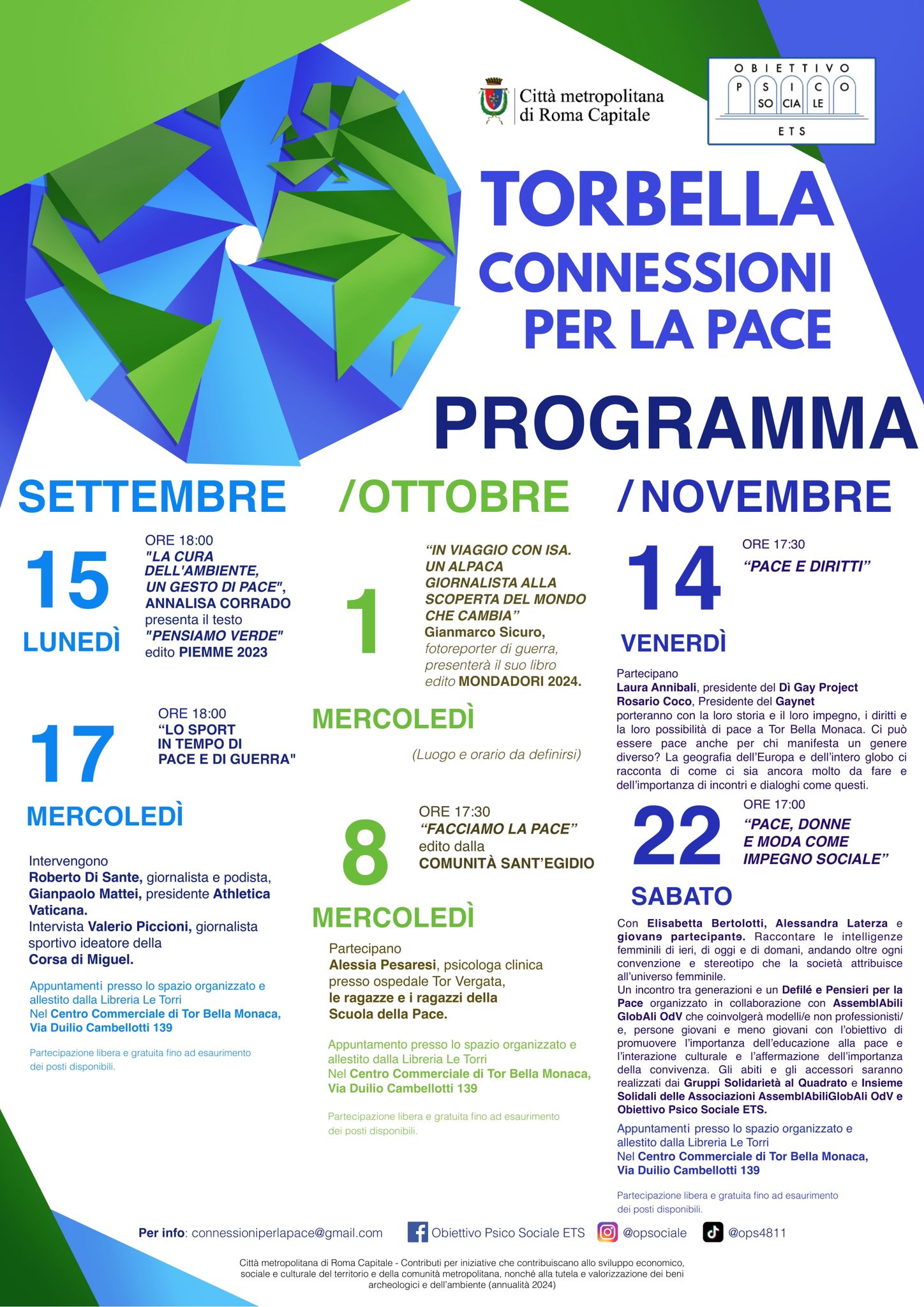 Prende avvio lunedì 15 settembre 2025 ore 18:00 a Roma Via Duilio Cambellotti 139 il progetto TORBELLA,CONNESSIONI PER LA PACE promosso e coordinato da Obiettivo Psico Sociale ETS. Una rassegna di eventi per diffondere la cultura della pluralità , della pace, per un mondo davvero inclusivo.