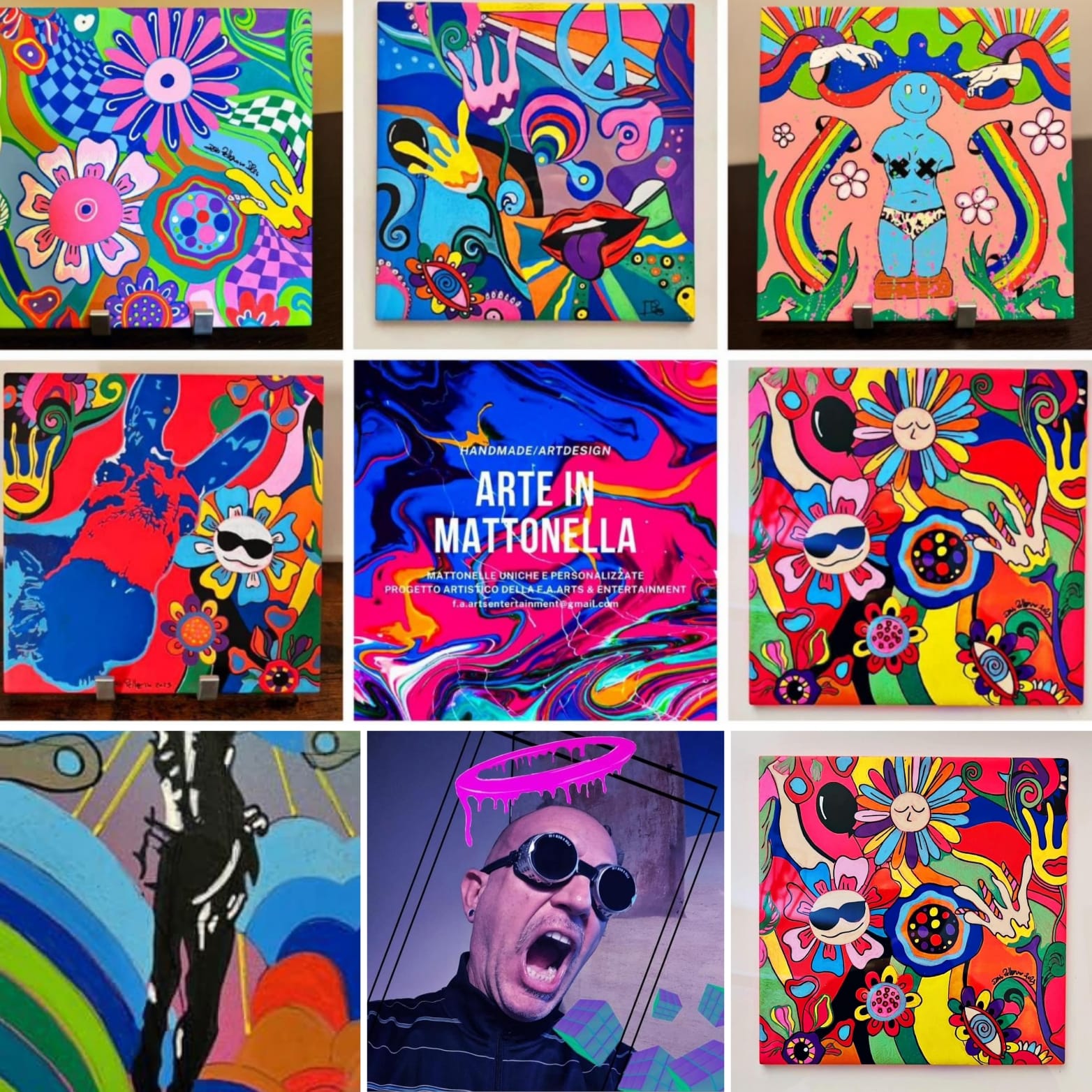 Dario Pellegrino, con la sua arte in mattonella, presenterà le sue opere dalla tecnica mista mostrando la parte più psichedelica della trasformazione della luce attraverso un linguaggio pop contemporaneo.
