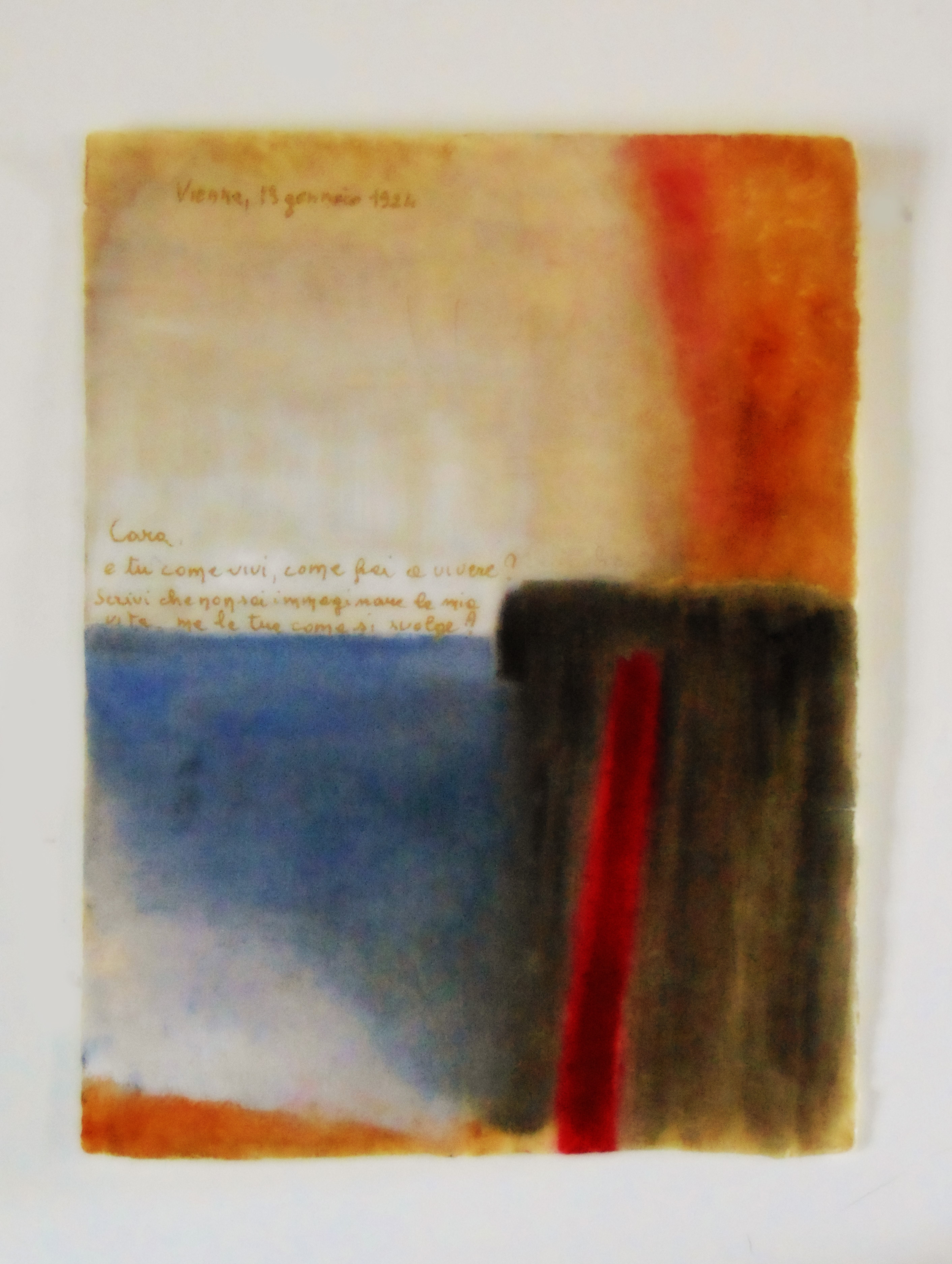 Il nuovo progetto artistico di Marina Baciocchi indaga, con una personalissima ricerca, l’aspetto più profondo e coinvolgente di una parte dell’epistolario Gramsciano, soffermandosi in particolare sul rapporto che legò il politico alla moglie Julca, alla cognata Tatiana e al figlio più grande Delio. Ogni lettera è come una tessera di un mosaico, ricco di sfumature e di intensa umanità, che ci offre uno straordinario autoritratto intellettuale, morale e politico di un uomo in cui la passione politica era passione per la vita e per gli esseri umani. In quest’ottica i 110 acquerelli della Baciocchi, ci propongono, in un intreccio di linee e colori, sua cifra di una lunga ricerca artistica, una personalissima interpretazione delle appassionate lettere dal carcere, in cui i colori ora sfumati, ora decisi ci restituiscono la poesia dei contenuti. Segno e colore sono da sempre una costante nell’opera della Baciocchi, che in questa particolare occasione riesce a rendere le righe scritte, segni della stessa sostanza del colore, restituendo ad essi quel mosaico di affetti e passioni che ci fanno innamorare del suo autore. Ogni acquerello costituisce una partitura musicale legata a tutti gli altri armonicamente.