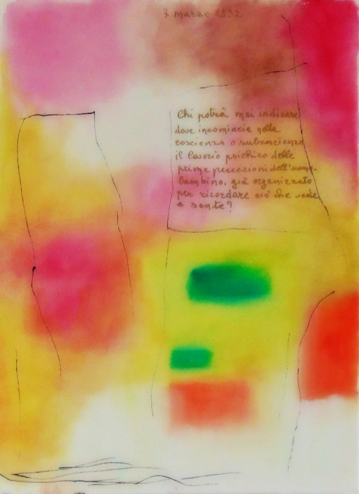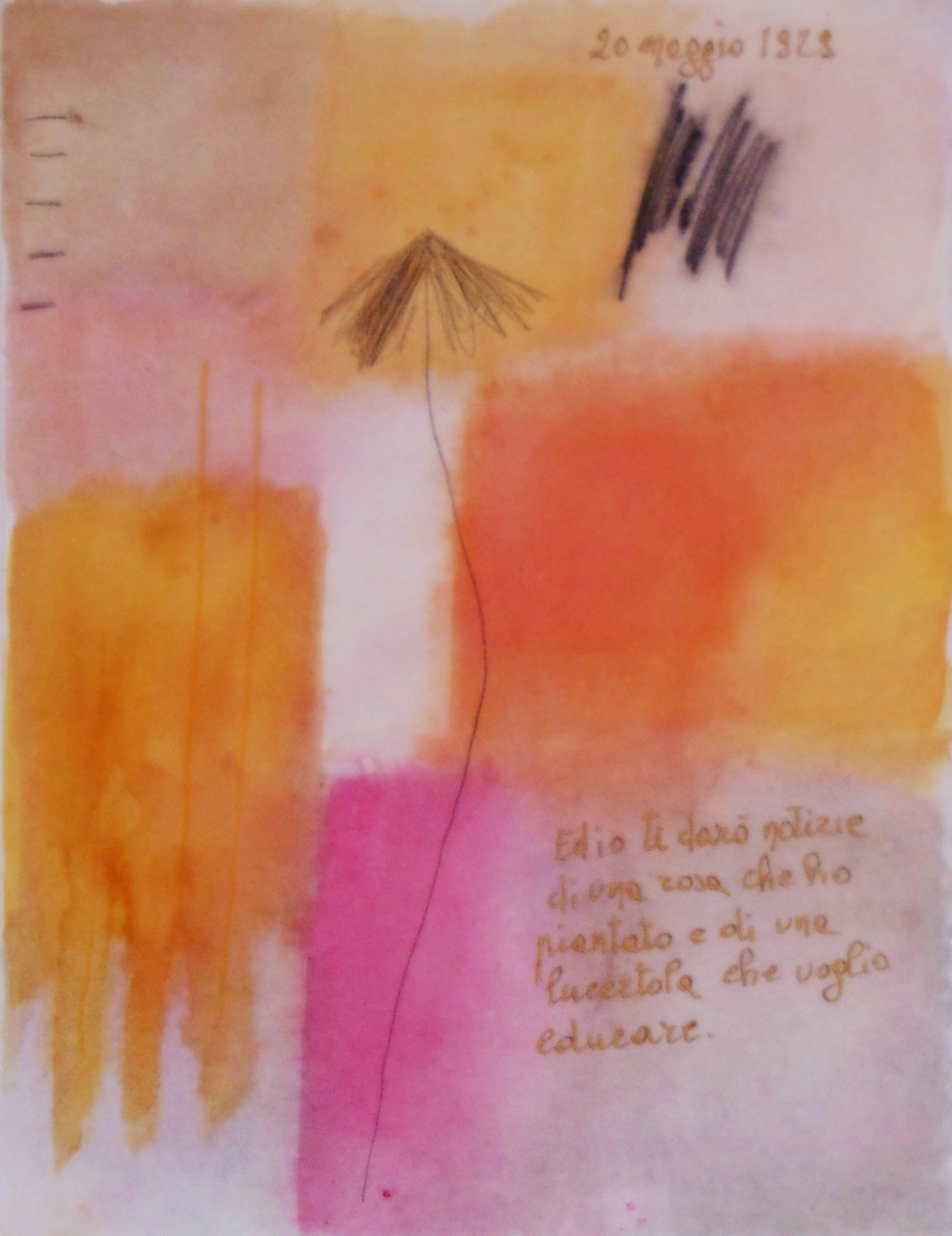 La ricerca di una fusione o di una separazione tra colore, segno musicale e scrittura è presente anche nelle opere precedenti come Le parole non dette, Le pagine scritte, Silenzio rosso, e nell’ultimo Una musica silenziosa dove la linea è segno e, nel costituirsi scrittura, ribadisce la peculiarità dell’essere umano che nella scrittura esprime la sua identità. Colore e linea trovano nell’artista quell’immagine dimenticata, che risuona del primo sentire umano senza parola, che potrà diventare, poi, per ognuno la ricerca di una vita.