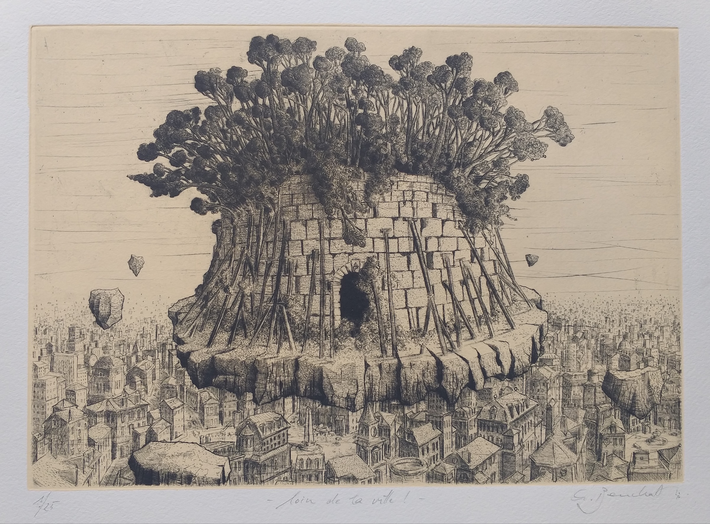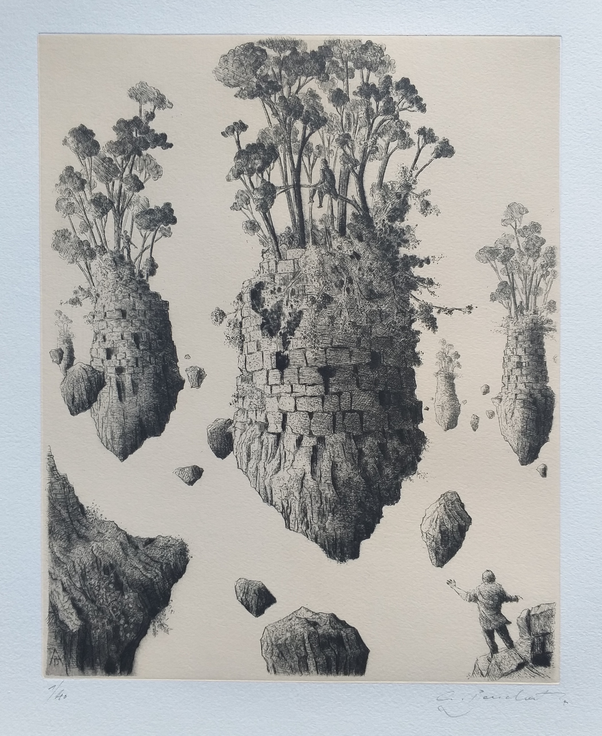 «Le sue acqueforti sanno d’una visione ad occhi aperti, d’una sorta di fiaba dai soggetti a volte notturni, ma più spesso sapendo di interminabili meriggi, dominati dal silenzio: come quando ci si sente sospesi tra il sonno e la veglia e ogni suono si smorza, sino a perdersi». La pregnante lettura dello storico dell’arte Angelo Dragone si attaglia perfettamente anche all’accurata selezione di incisioni esposte nella biblioteca luganese. L’artista consegna al nostro sguardo, stupito e incantato, immagini di grande forza evocativa: un mondo “altro” dove architetture fantastiche, costruzioni labirintiche dalle prospettive ardite, torri dalle sembianze antropomorfe si alternano a paesaggi enigmatici, deserti e sospesi in atmosfere senza tempo.