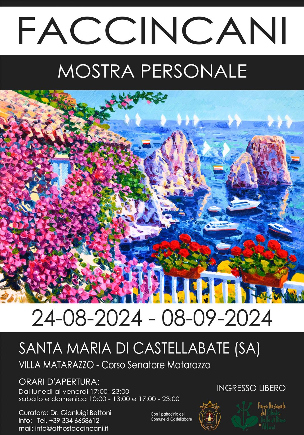 Con il Patrocinio del Comune di Castellabate e del Parco Nazionale del Cilento, Vallo di Diano e Alburni, da sabato 24 Agosto a domenica 8 Settembre il Maestro Athos Faccincani espone presso le Villa Matarazzo a Santa Maria di Castellabate, ormai vero e proprio salotto della cultura per i numerosi e prestigiosi eventi che ivi si realizzano.