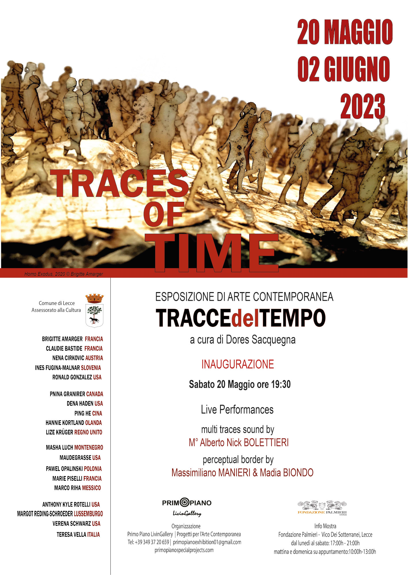 Primo Piano LivinGallery ha il piacere di presentare la mostra d’arte contemporanea Tracce del tempo, curata da Dores Sacquegna e allestita presso la Fondazione Palmieri a Lecce. L’evento, patrocinato dal Comune di Lecce, si inaugura sabato 20 Maggio alle ore 19:30 alla presenza degli artisti. Durante l’opening la performance Perceptual Border di Massimiliano Manieri (con la partecipazione di Madia Biondo) e Multi Tracce una loop station che descrive, attraverso le sonorità del trombone, le tracce del tempo, come scorrimento del battito, del musicista e compositore M° Alberto “Nick” Bolettieri.