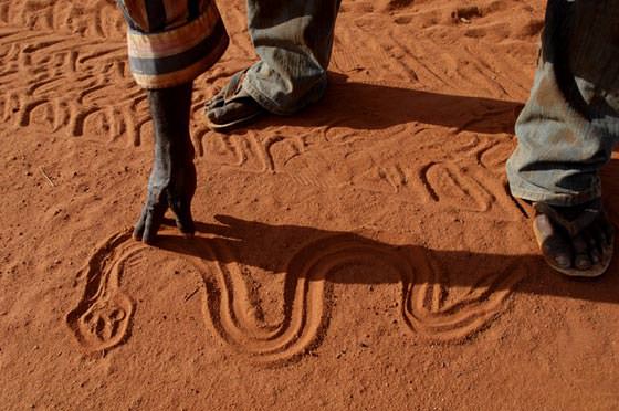 Le pitture aborigene liberano lo spettatore dalla costrizione del verso dell’immagine perché si guardano come si guarda il cielo stellato, senza un alto e senza un basso. Ogni immagine può essere vista da ogni lato, ruotandovi intorno e lasciandosi catturare dalle geometrie ipnotiche che portano a cogliere il quadro non per quello che rappresenta ma per quello che è, permettendoci di vedere i loro sogni e le loro visioni sacre.