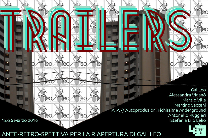 Per la riapertura dello Spazio una collettiva senza soluzione di continuità, per presentare e ripresentare il Modello GaliLeo: la volontà di esporre non un’idea per l’arte ma un’idea dell’Arte. Trailers è tutto il nostro passato ed il nostro futuro.