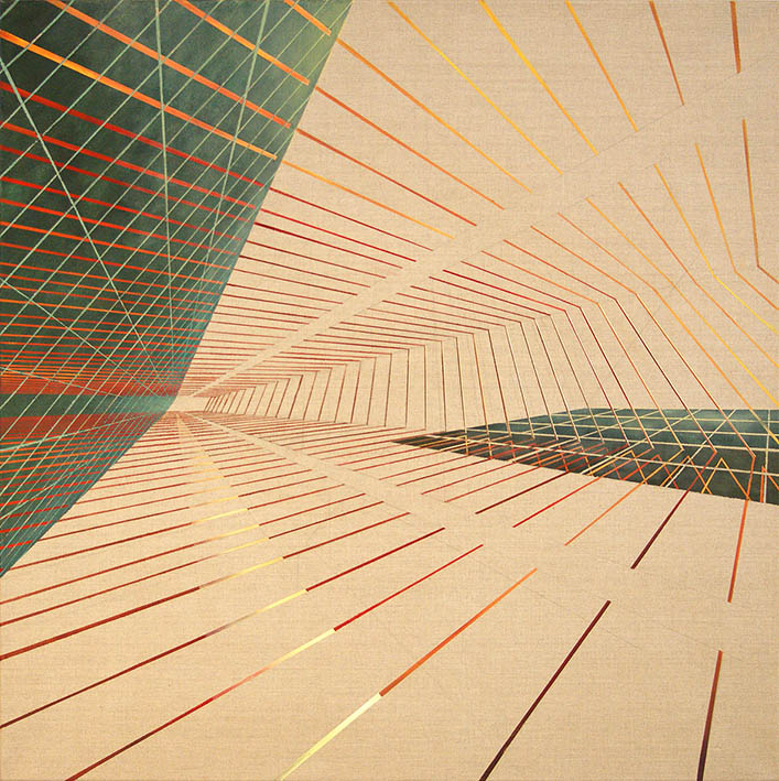 (Scozia 1985) e Paolo Cavinato (Italia 1975). Entrambi gli artisti, pur con tecniche diversissime, rappresentano piani, superfici e linee che descrivono uno “Spazio Altro”, spaesato e spaesante, astratto e figurativo allo stesso tempo I dipinti di Daniel Mullen, perlopiù acrilici su lino, sorprendenti per la loro esecuzione, rappresentano piani intersecanti che fluttuano nello spazio siderale, mentre linee astratte ricordano i tunnel temporali a cui ci hanno abituato le saghe cinematografiche come Star Trek o Guerre stellari.