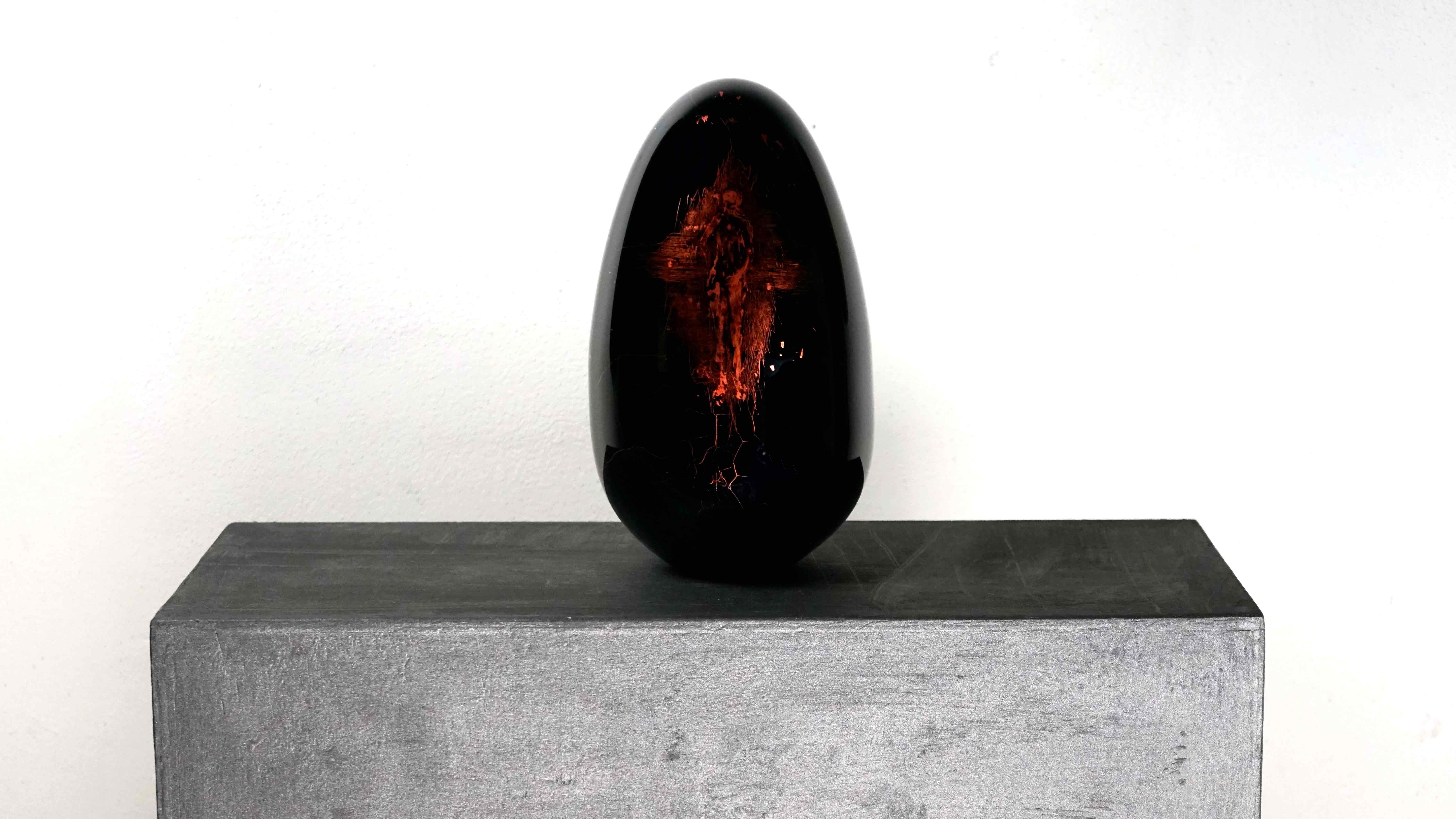 Bruno Ceccobelli con i suoi vetri realizzati con la tecnica della pressofusione, riflette in particolare sulla condizione dell’esperienza del passato, della dimensione del “transporto”, ottenuta concretamente utilizzando come “pennello” il fuoco, che è luce e dimensione del nostro tempo.