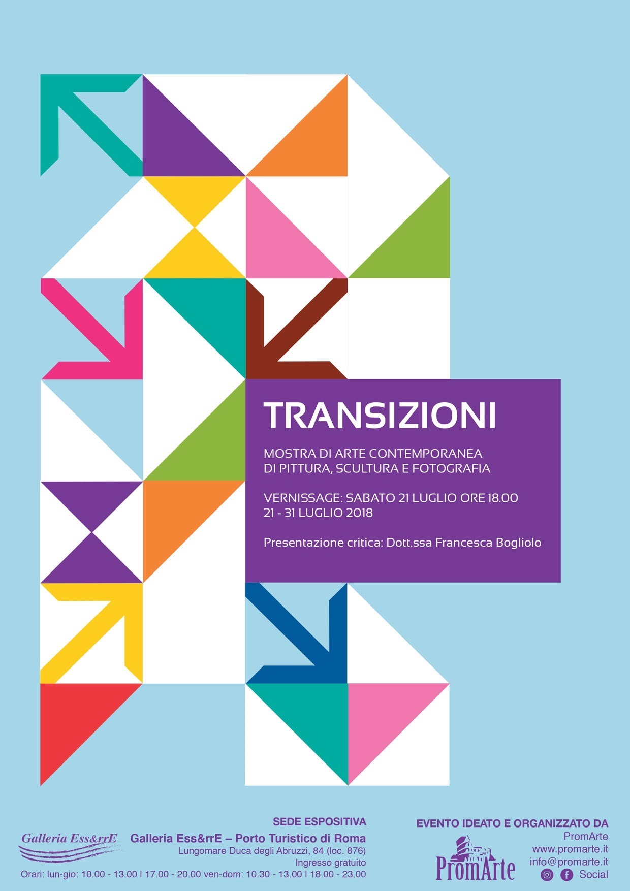 La collettiva di arte contemporanea sarà aperta al pubblico dal 21 al 31 luglio 2018 e sarà ospitata dalla Galleria Ess&rrE, cornice perfetta per accogliere “Transizioni”. Lo spazio espositivo si trova infatti presso il Porto Turistico di Roma, luogo per eccellenza di passaggi, ritorni e dipartite, incontri e addii, spazio di transizioni e soglia verso un altrove. La mostra sarà presentata dalla Dott.ssa Francesca Bogliolo, critico d’arte e autrice di importanti pubblicazioni.