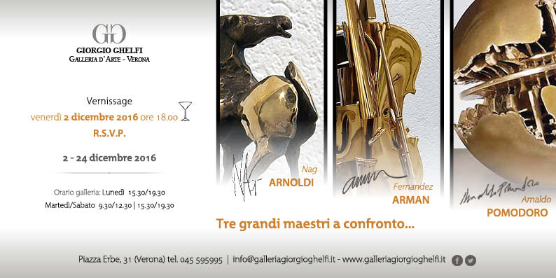 Venerdì 2 dicembre 2016 alle ore 18.00 si inaugurerà la mostra “Tre Grandi scultori a confronto: Nag Arnoldi, Fernandez Arman e Arnaldo Pomodoro”.