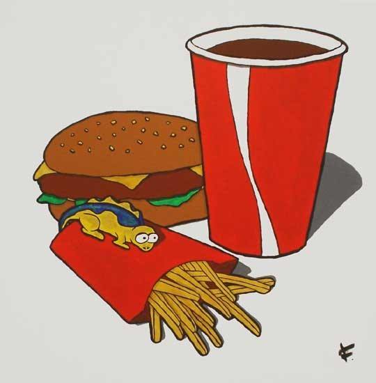 Fabiano Speziari reinterpreta il pop. La stretta correlazione esistente tra i suoi quadri e i titoli che ad essi attribuisce suggerisce che il punto di partenza, per Speziari, è sempre e comunque l’idea che nasce da un’attenta, graffiante e talvolta cinica visione della realtà. Mi riferisco, ad esempio, al missile raffigurato in “Have a good day”, alla dea Kali in versione cibernetica di “Nuova divinità moderna”, e ancora alla salamandra che s’arrampica sul cibo da fast food in “Natura morta con regional country manager”. La resa finale è quella di un disegno pulito, essenziale, dal colore piatto, ma il cui risultato sembra voler fuoriuscire dalla tela bianca circostante, abbandonare la propria bidimensionalità per arrivare diretto e senza artifici agli occhi del fruitore.