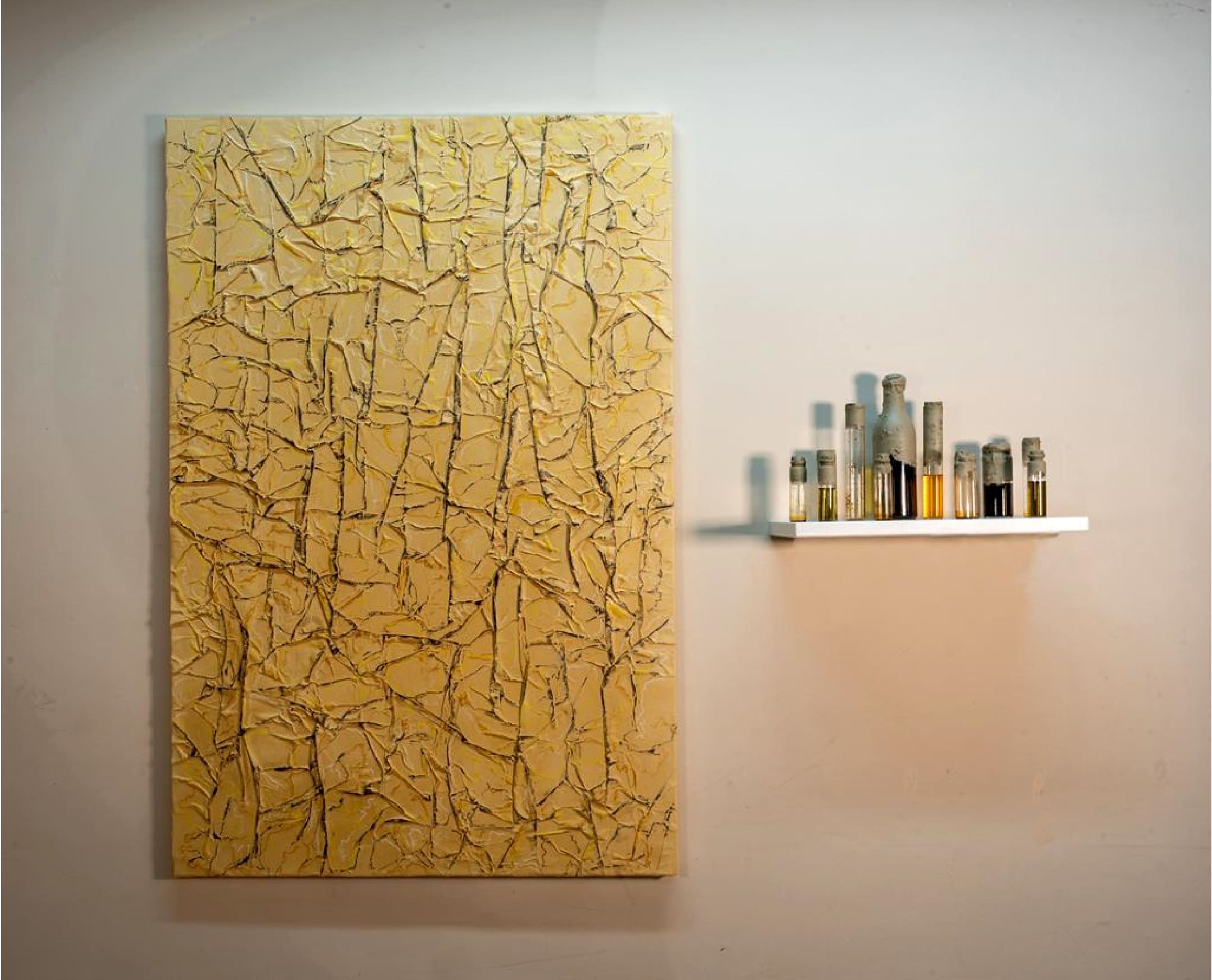 Caterina Ciuffetelli è nata a L’Aquila nel 1956 e vive a Terni. Il suo lavoro si distingue per la continua sperimentazione: utilizza vari materiali, dalla corda al filo, alla stoffa, dal gesso all’intonaco, dalla sabbia alla carta, dalla fotografia alla lana di pecora, dalla foglia d’oro al polistirolo, all’alluminio, al cellotex. Si tratta di materiali poveri, molti di utilizzo industriale, che vengono tagliati, manipolati e assemblati, senza mai però dimenticare il “quadro” che si presenta “pittorico” anche se non vengono usati i colori direttamente, infatti sono le carte e le materie che sono colorate.