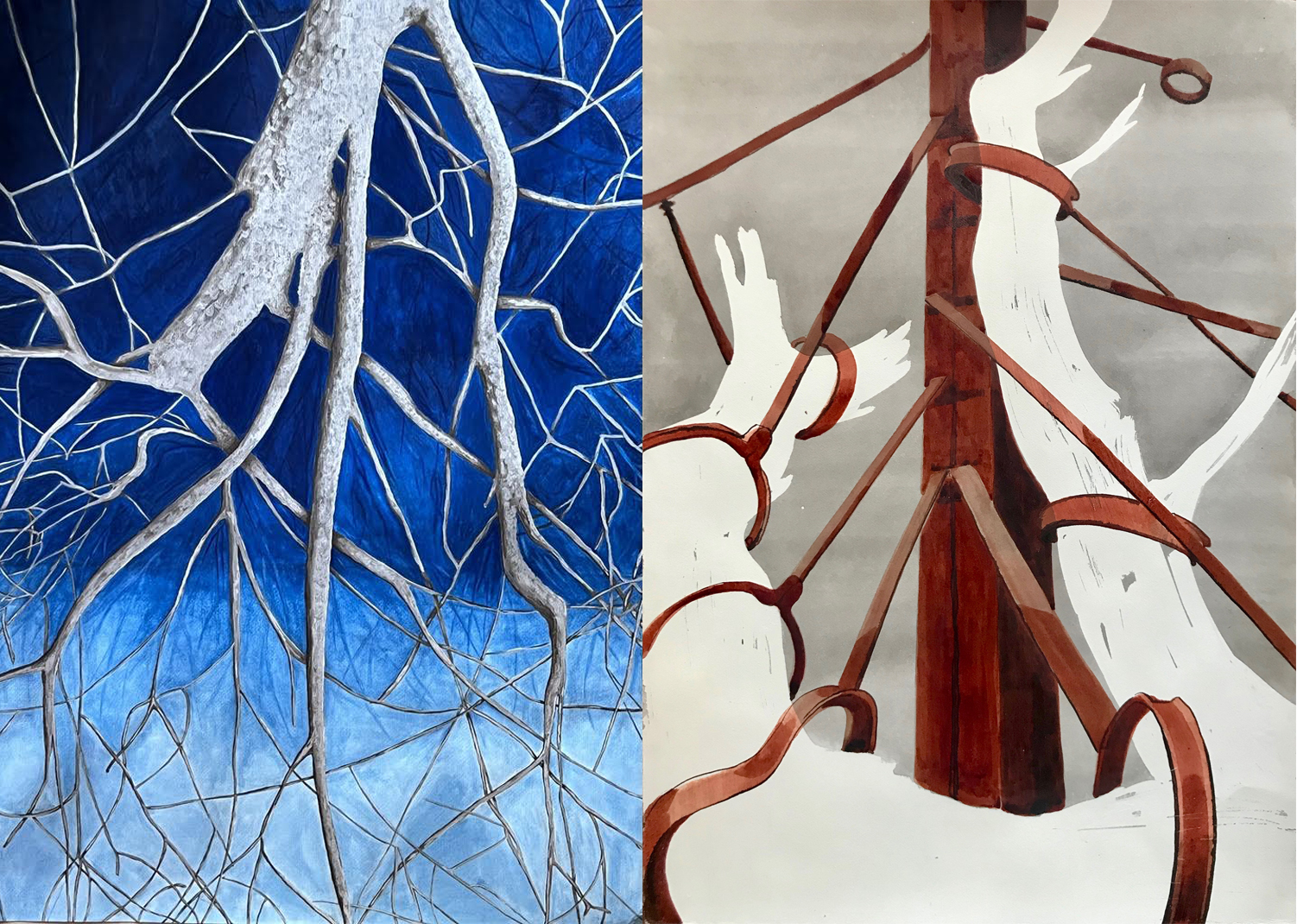 Ecco quindi che, sia Caroline Bouguereau che Xenia Kravchenko, fondano la propria ricerca artistica sull’esplorazione della relazione uomo-natura - argomento che da sempre è fonte di ispirazione per artisti visivi e scrittori - sottolineando le similitudini e, soprattutto, la stretta, imprescindibile correlazione. Esse sembrano infatti riferirsi al mondo vegetale (agli alberi, nello specifico) per rappresentare lo spazio, materiale e spirituale, che l'uomo occupa nel mondo e comprendere il senso del suo agire.