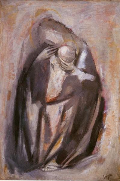 A novantacinque anni Trento Longaretti dipinge ancora con lo spirito del primo giorno, quello del fanciullo. Un’immagine che tante volte ritorna nelle sue tele, accanto alla madre. «Avrò dipinto la madre mille volte – dice l’artista –. Mi colpisce come i bambini si attacchino a lei, quasi fossero una cosa sola perché la mamma è tutto: bene, protezione, speranza. La Madonna è madre e il suo mistero vive in ogni maternità».