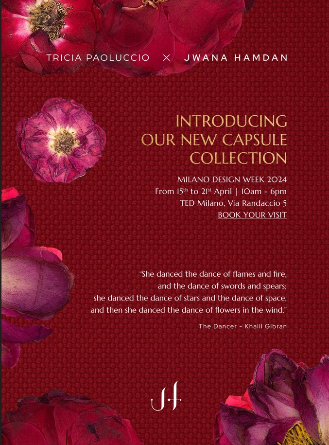 Jwana Hamdan ha il piacere di invitarti alla presentazione della nuova capsule collection in collaborazione con Tricia Paoluccio.