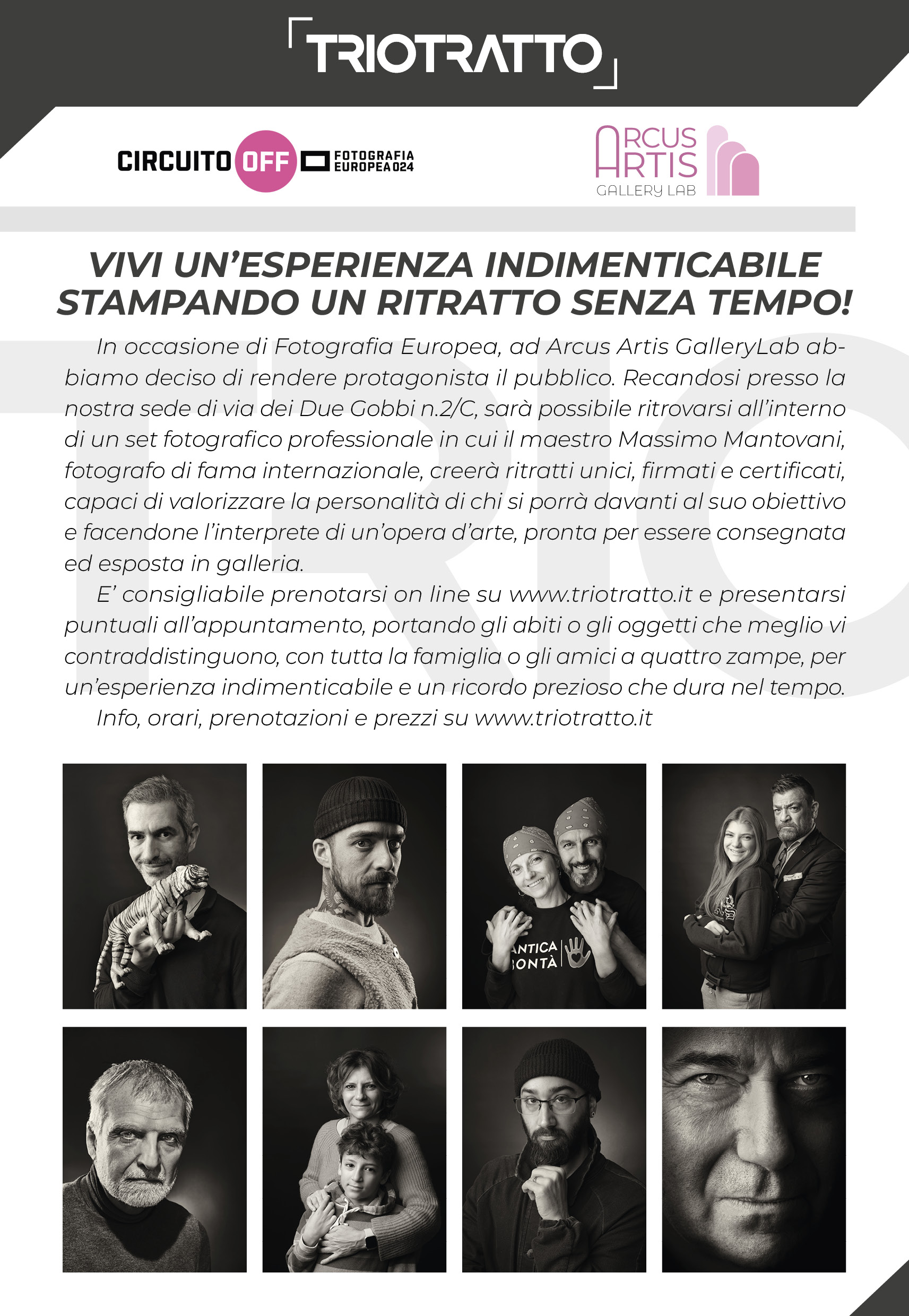 In occasione di Fotografia Europea, ad Arcus Artis GalleryLab abbiamo deciso di rendere protagonista il pubblico. Recandosi presso la nostra sede di via dei Due Gobbi n.2/c, sarà possibile ritrovarsi all'interno di un set fotografico professionale in cui il maestro Massimo Mantovani, fotografo di fama internazionale, creerà ritratti unici, firmati e certificati, capaci di valorizzare la personalità di chi si porrà davanti al suo obiettivo e facendone l'interprete di un'opera d'arte, pronta per essere consegnata ed esposta in galleria. E' consigliabile prenotarsi on line su www.triotratto.it e presentarsi puntuali all'appuntamento, portando gli abiti o gli oggetti che meglio contraddistinguono, con tutta la famiglia o gli amici a quattro zampe, per un'esperienza indimenticabile e un ricordo prezioso che dura nel tempo. Info, orari, prenotazioni e prezzi su www.triotratto.it