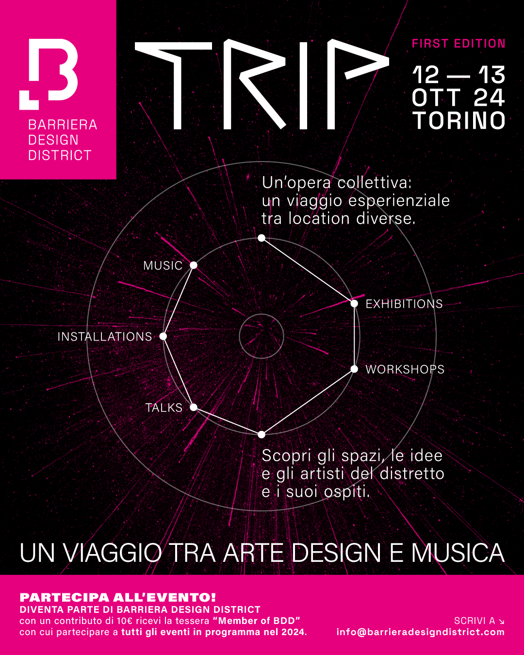 La mostra collettiva TRIP è concepita come un evento sincronico e multidisciplinare che fonde arte contemporanea, design, musica, esperienze didattiche e visite in location uniche, aperte eccezionalmente al pubblico di BDD, e che ospiteranno una serie di iniziative curate da Lucrezia Nardi, docente presso lo IAAD di Torino e curatrice indipendente. L’idea è quella di un viaggio, sia in termini di location che costituiscono la mappatura del distretto, sia in termini di pratiche, storie, narrazioni e fenomeni che si contaminano e si attivano con la fruizione del pubblico. Talk, mostre, studi aperti, workshop, mostre personali di artisti cittadini ospiti presso le realtà di Barriera Design District, performance, videoproiezioni e una suggestiva sound experience finale costituiranno la cornice per inaugurare la prima stagione culturale di Barriera Design District. Realtà che, come una costellazione, si illuminano aprendo le loro porte per presentarci le loro attività e ospitando eventi curati per rappresentare l’idea che ci costituisce: un luogo di incontri, dialogo e cooperazione tra persone e discipline. Frammenti che compongono un'opera complessiva, così come le diverse realtà che costituiscono Barriera Design District.