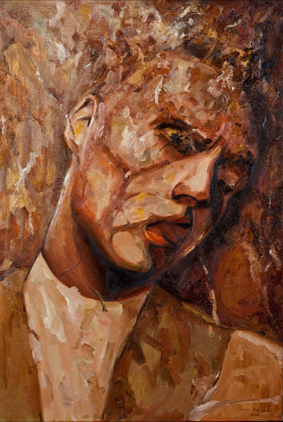 Si affida ad un gesto pittorico di stampo decisamente espressionista Marino Benigna. Con inquieta sottigliezza psicologica, la sua pennellata scava i volti, affonda con rapidi segni vibranti nelle tenebre e negli insani guizzi di coscienza degli sguardi, nelle pieghe delle bocche contorte in espressioni primordiali. E con tratti corsivi, turbinosi, ma al tempo stesso precisi, misurati, egli crea tensioni tra colpi di luce e macchie d’ombra nella stesura di una pittura ad olio densa e pastosa, tremula e carnale, facendo tesoro della lezione della Pittura Tonale ma contaminandola con una impaginazione cezanniana che scompone i piani della superficie per dare ancora più corpo e presenza ai volti. Sono presenze inquete e tragiche quelle che affiorano dalle tele di Benigna. (VP)