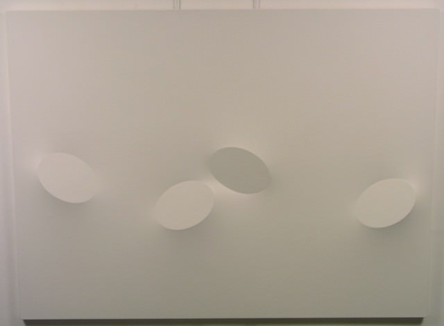Dal 1962 ha assunto la forma primaria dell’uovo, prima serializzata in rilievo mediante collage e poi ottenuta attraverso spessori di legno ritagliati e apposti sotto la tela. Così facendo il telaio anziché nido di forme diventa forma esso stesso.