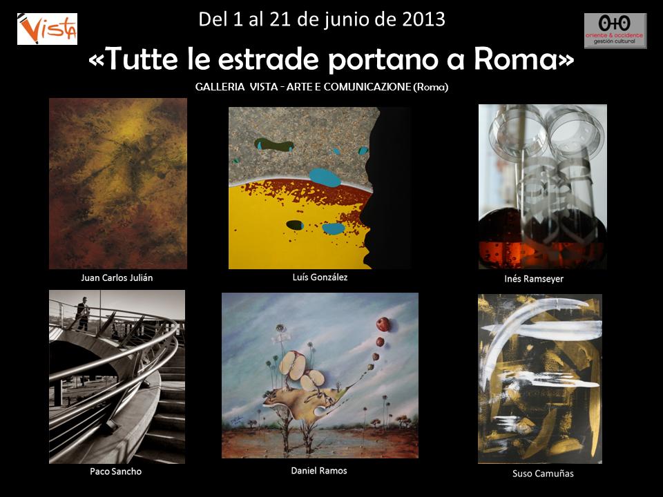 Il Centro d’Arte VISTA in collaborazione con la Galleria O+O Oriente+Occidente di Valencia presenta “Tutte le estrade portano a Roma” a cura di Enriqueta Hueso e Salvatore Battista Grimaldi, le ultime ricerche di 6 artisti contemporanei spagnoli: Luís González, Juan Carlos Julian, Paco Sancho, Daniel Ramos, Inés Ramseyer, Suso Camuñas.