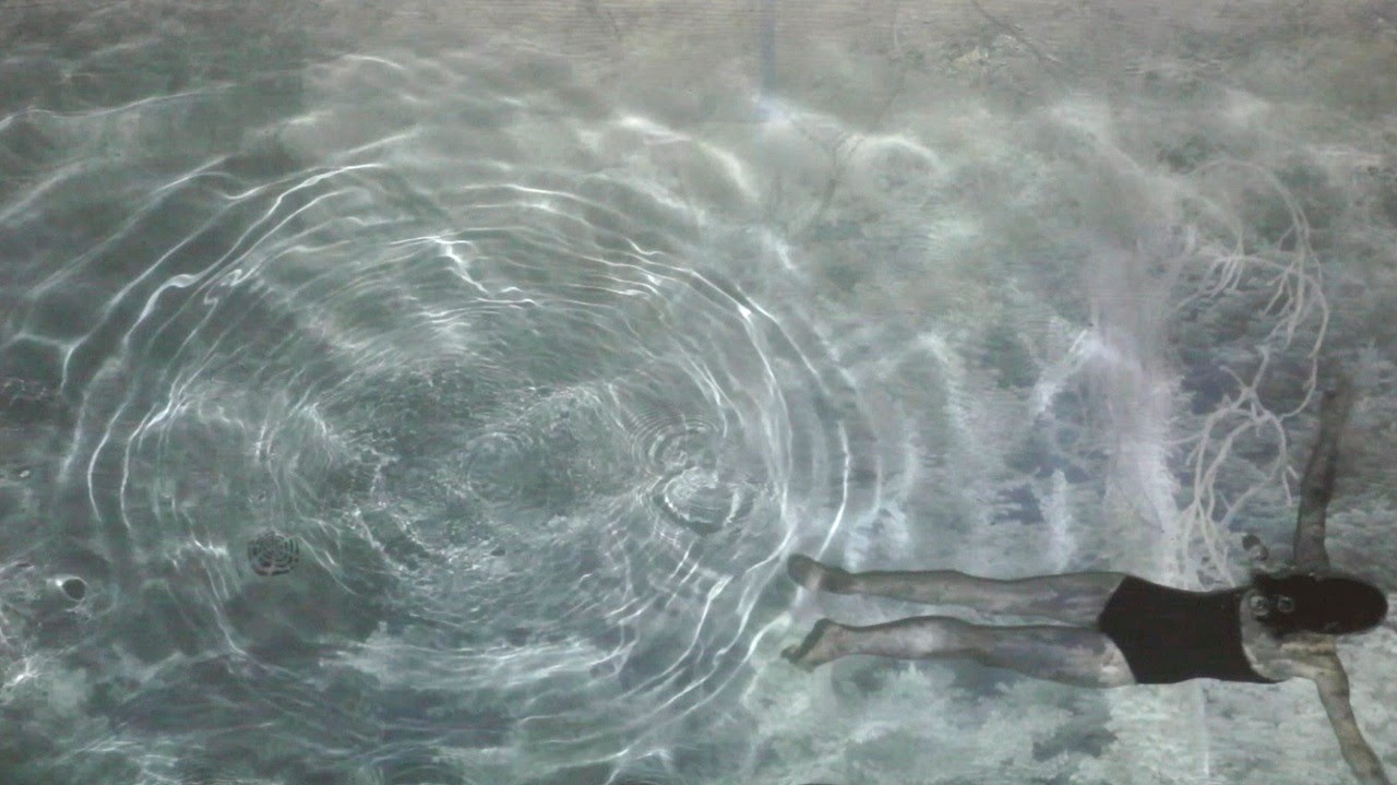 e una donna che attraversano una piscina su cui si riflette un bosco di confine