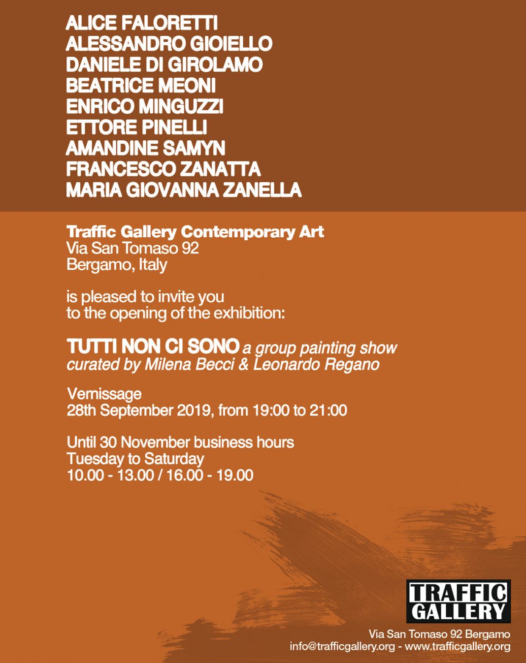 Traffic Gallery è orgogliosa di presentare TUTTI NON CI SONO, una mostra collettiva dedicata al mezzo pittorico con artisti facenti parte di tre generazioni diverse. Uno sguardo sulla pluralità del mezzo pittorico contemporaneo affrontato con modalità, sfumature ed esiti spesso distanti tra loro. Nove è il numero degli artisti partecipanti (ordine alfabetico) :