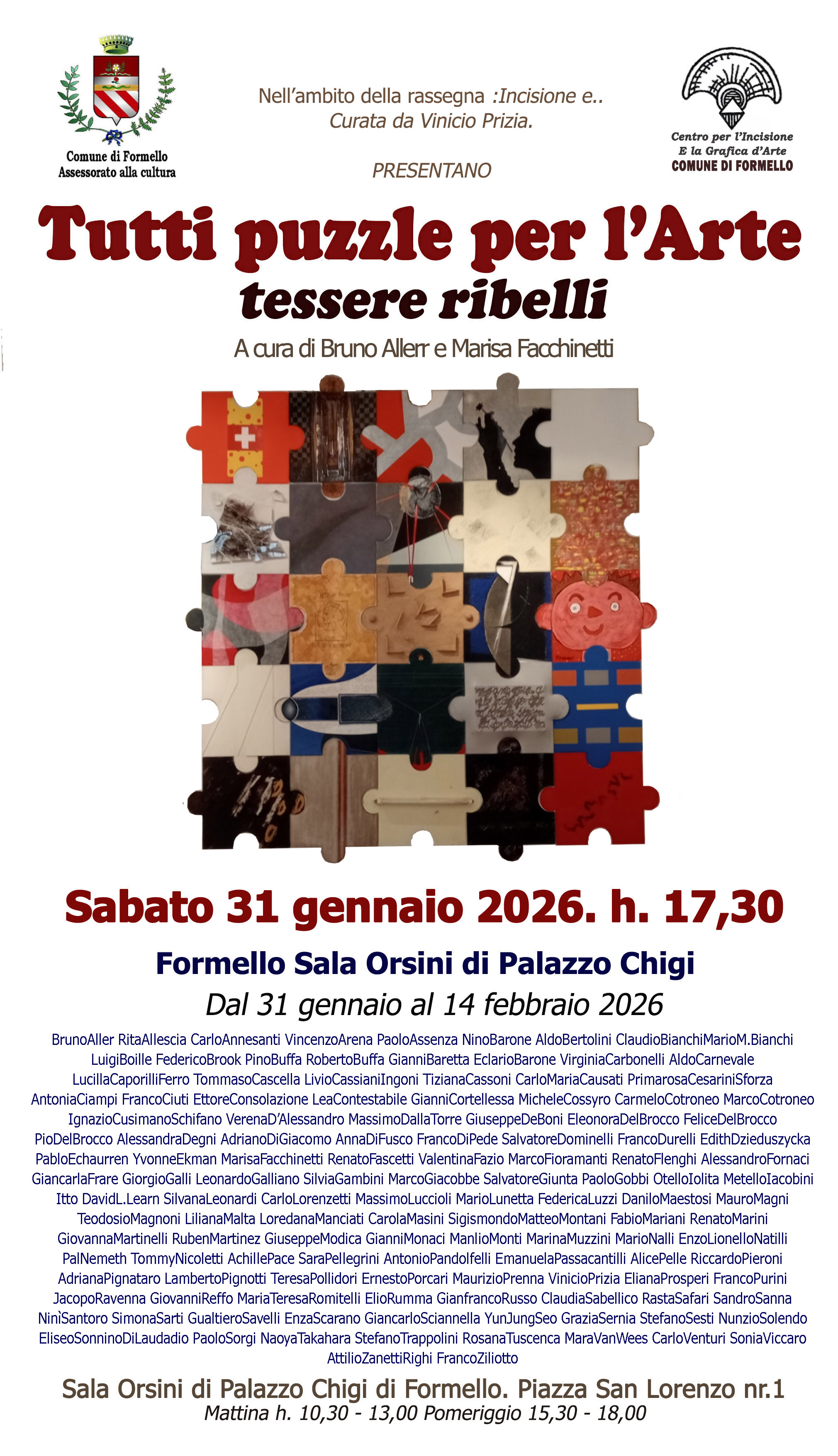 Ed oggi siamo qui a Formello accolti con il nostro “Puzzle” collettivo nella sala Orsini di palazzo Chigi, grazie all’impegno dell’artista e Direttore artistico Vinicio Prizia.