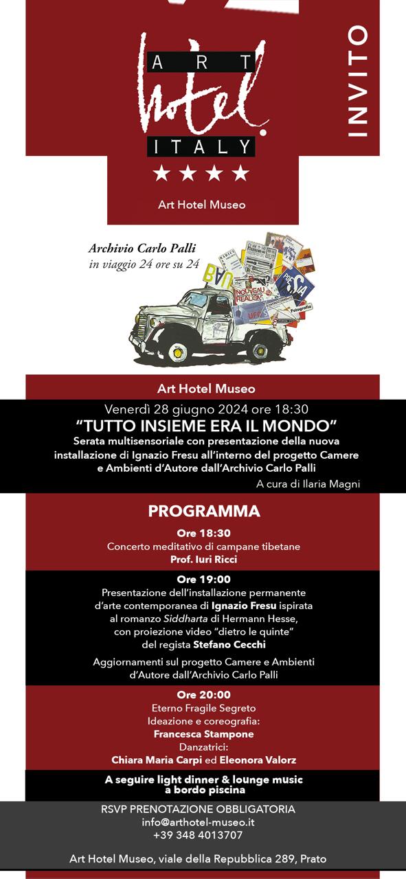 Presso l’Art Hotel Museo di Prato nuovo appuntamento con l’arte: venerdì 28 giugno 2024 alle ore 18:30 andrà in scena una serata multisensoriale con focus nella presentazione dell’installazione permanente di Ignazio Fresu, ispirata ad un passo del romanzo Siddharta di Hermann Hesse ed inserita all’interno del progetto Camere ed Ambienti d’Autore dall’Archivio Carlo Palli. Sarà anche l’occasione per fare il punto sul progetto che, grazie al collezionista Palli, vede l’Art Hotel Museo come un vero e proprio contenitore d’arte contemporanea in divenire.