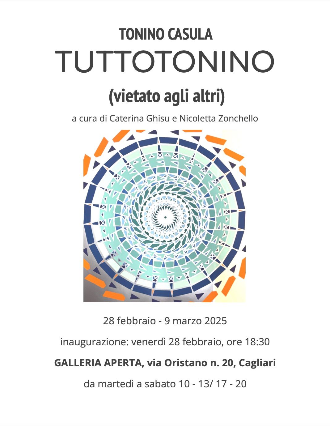 Si dedica all’arte dagli anni Cinquanta e alla Galleria Aperta abbiamo una rara testimonianza della sua attività prima di co-fondare, nel 1966, il Gruppo Transazionale, con cui porta avanti, a livello nazionale e internazionale, le ricerche sull’ambiguità della visione. Si potrebbe includere in un filone della Optical Art ma è VIETATO, come la sua serie degli anni Settanta. Tonino Casula non è incasellabile.