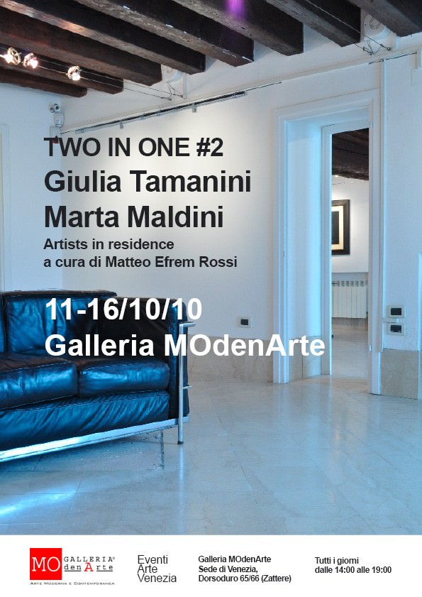Una sala della Galleria ModenArte di Venezia diventerà un atelier che accoglierà le artiste Giulia Tamanini e Marta Maldini. Lo spazio della galleria rimarrà aperto al pubblico durante la permanenza delle due artiste. Chiuderà l’evento una mostra che presenterà il lavoro svolto.