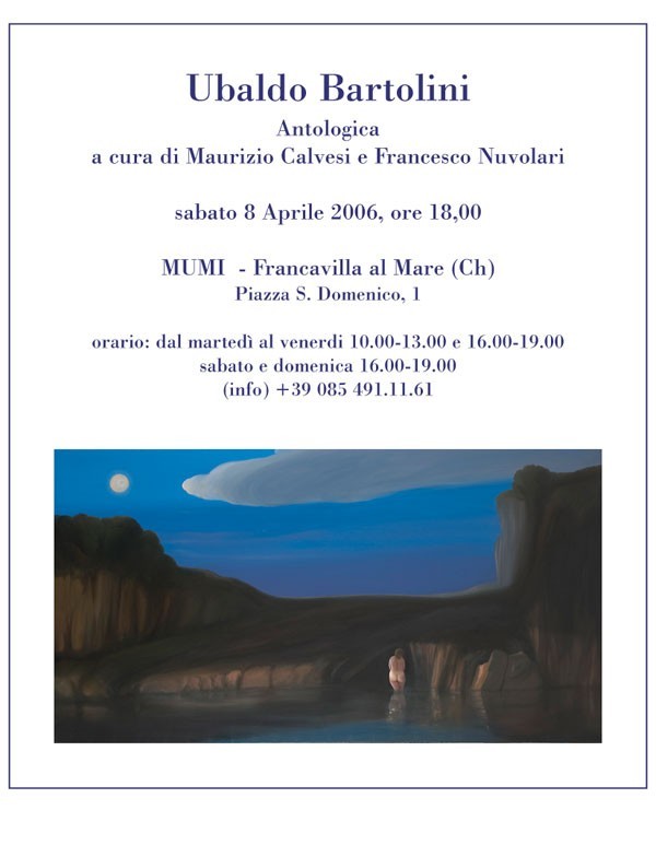 L’8 aprile 2006, alle ore 18 presso le sale del Museo Michetti (MUMI) di Francavilla al Mare (Chieti) si inaugurerà l’importante mostra ”Ubaldo Bartolini” a cura di Maurizio Calvesi e Francesco Nuvolari. L’esposizione, realizzata grazie all’Assessorato alla Cultura del Comune di Francavilla al Mare, rimarrà aperta fino al 31 maggio 2006. Saranno esposti 70 quadri di vario formato, molti dei quali per la prima volta. Per l’occasione è stato pubblicato dalla casa editrice Effe G Enne un importante e raffinato volume a cura di Maurizio Calvesi e Francesco Nuvolari di 144 pagine all’interno del quale si trovano, oltre alle opere esposte, tutte le più significative realizzazioni dell’artista Bartolini, ritenuto il più importante pittore pae