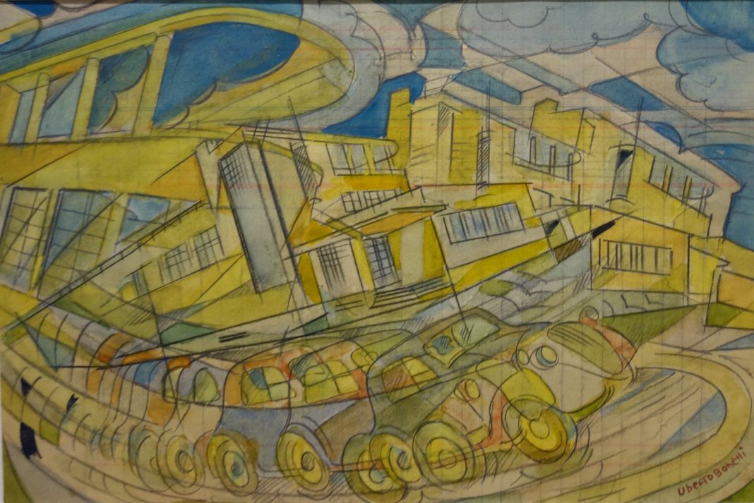 Nel 1931, quando iniziò a lavorare alle tavole che compongono la serie delle Aeroviste d’Italia, Uberto Bonetti era un giovane di talento, noto nell’ambito artistico viareggino soprattutto per essere l’ideatore della famosa maschera carnevalesca di Burlamacco, con all’attivo già diverse rilevanti esperienze come illustratore, scenografo, costumista e disegnatore. Il suo entusiasmo per il Futurismo e la fascinazione per il volo non poterono che sfociare in un’appassionata adesione all’Aeropittura, che del cosiddetto Secondo Futurismo rappresenta probabilmente l’espressione più significativa e interessante. Ben inserito nel mondo della cultura e dell’arte, frequentava personalità quali Filippo Tommaso Marinetti, Luigi Pirandello, Italo Balbo e Krimer. Questi ultimi gli suggerirono di sviluppare una serie di tavole che, in linea con le ricerche grafiche che stava già autonomamente elaborando, raffigurassero in eclatante stile futurista le città italiane. Lo scopo era realizzare delle sintesi visive delle realtà urbane contemporanee, dalle quali sarebbero poi stati tratti dei pannelli decorativi da collocare nelle sedi diplomatiche delle colonie. Questo suggerimento si concretizzò in una committenza e, come tale, doveva rispondere ad alcuni requisiti anche propagandistici. Così, accanto alle scontate città d’arte, figurano celebri località turistiche e mondane, le realtà industriali vanto di uno sviluppo economico utile all’Italia ad accreditarsi come nazione moderna, e naturalmente le città di fondazione fascista. Sorvolando la penisola (dal 1932 al 1938 circa), Bonetti scattava fotografie e faceva schizzi che poi assemblava e rielaborava in lavori più strutturati a tecnica mista su carta, con una predilezione per l’acquerello. Il modello di ridefinizione compositiva metteva in primo piano le architetture della città, ripetendole come un’immagine frazionata dal vortice dell’elica, scomposte in segmenti come fotogrammi in veloce sequenza poi ricomposti. L’effetto finale di questa fase intermedia di realizzazione, che coniuga l’originalità del punto di vista e la velocità, è straordinariamente dinamico. Purtroppo, nessuno dei pannelli definitivi è stato a tutt’oggi rintracciato, ma restano moltissimi di questi “studi”, che sono la grande eredità futurista di Bonetti. In mostra se ne possono ammirare oltre quaranta, tra cui quelli dedicati a Torino, in particolare all’architettura fascista e alla Fiat, al Piemonte, con Sestrière, Cuneo, Novara, diverse località liguri e una selezione di altre città risolte in maniera esemplare.