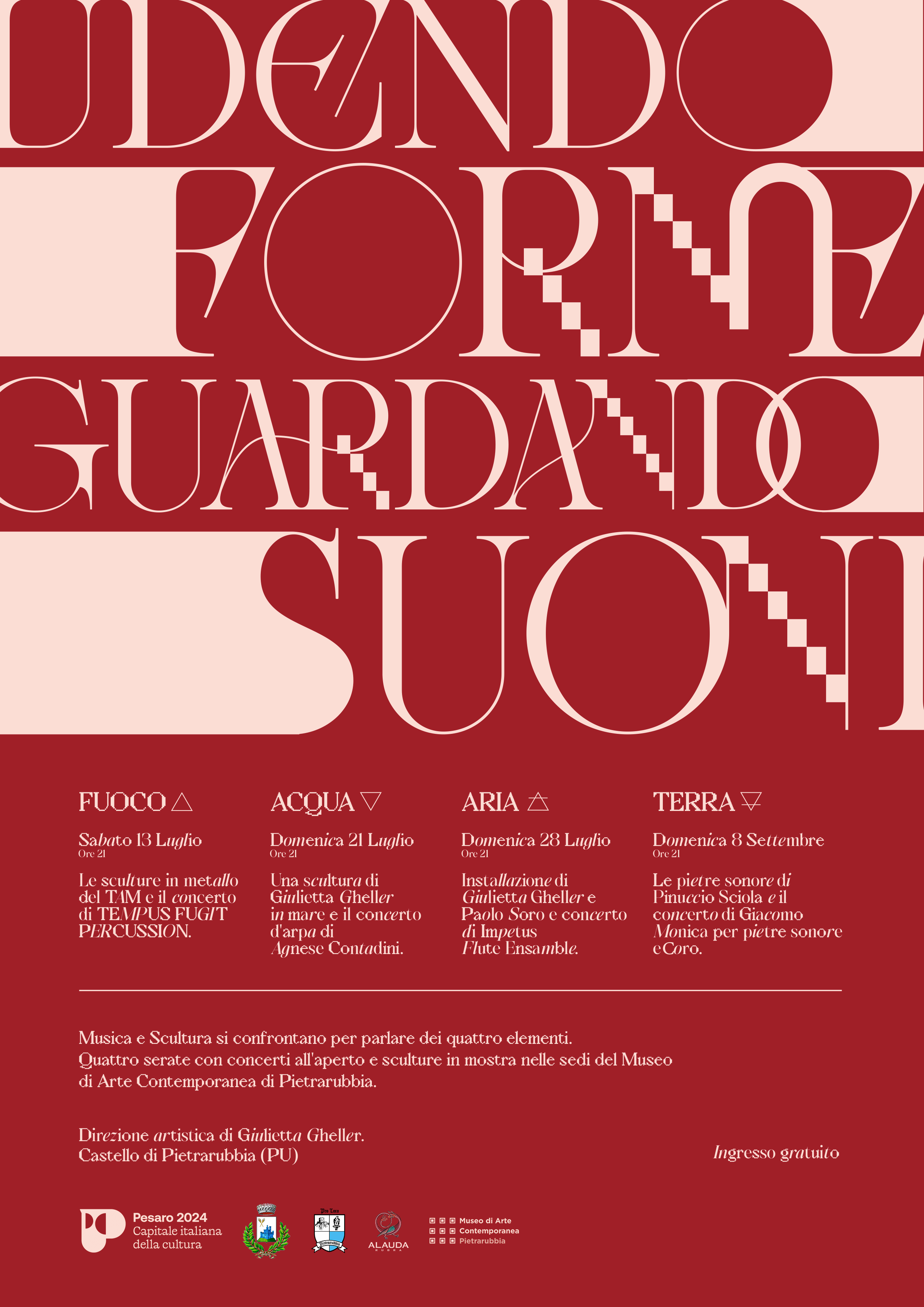 Il tema dei quattro elementi, Terra, Fuoco, Acqua e Aria, condurrà un ciclo di quattro eventi in cui, nel borgo di Pietrarubbia, nell’ex-TAM verranno legate esposizioni di scultura contemporanea, performance d’arte e musica.