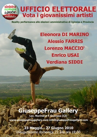Con lo slogan:”Volevate i giovani? Ecco i giovanissimi”, gli artisti, tutti rigorosamente under 21, della GiuseppeFrau Gallery (Eleonora Di Marino, Alessio Farris, Enrico Usai, Lorenzo Macciò, Verdiana Siddi) sono scesi in campo con la lista di Sinistra Ecologia e Libertà nelle elezioni amministrative per il Comune di Iglesias e per la Provincia.