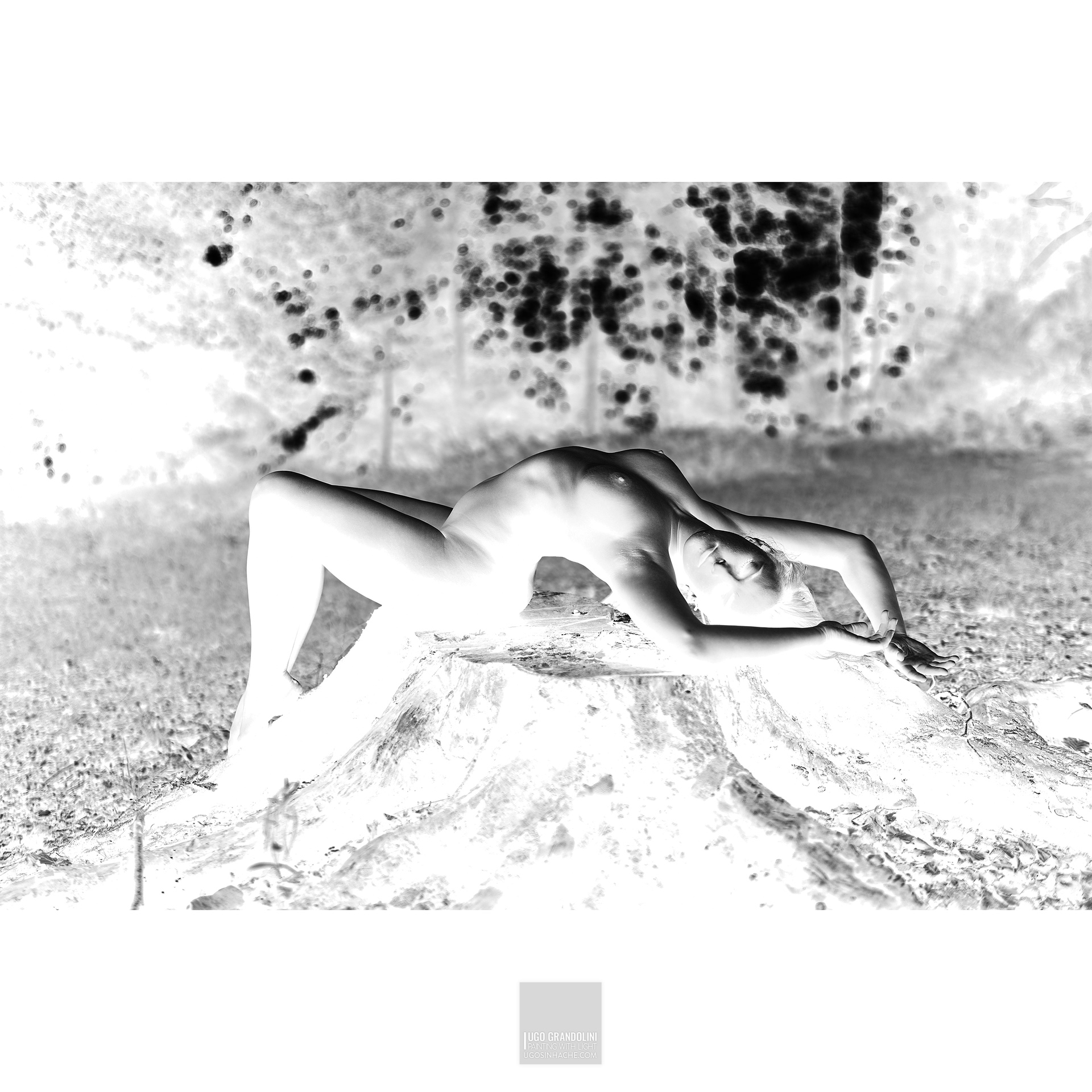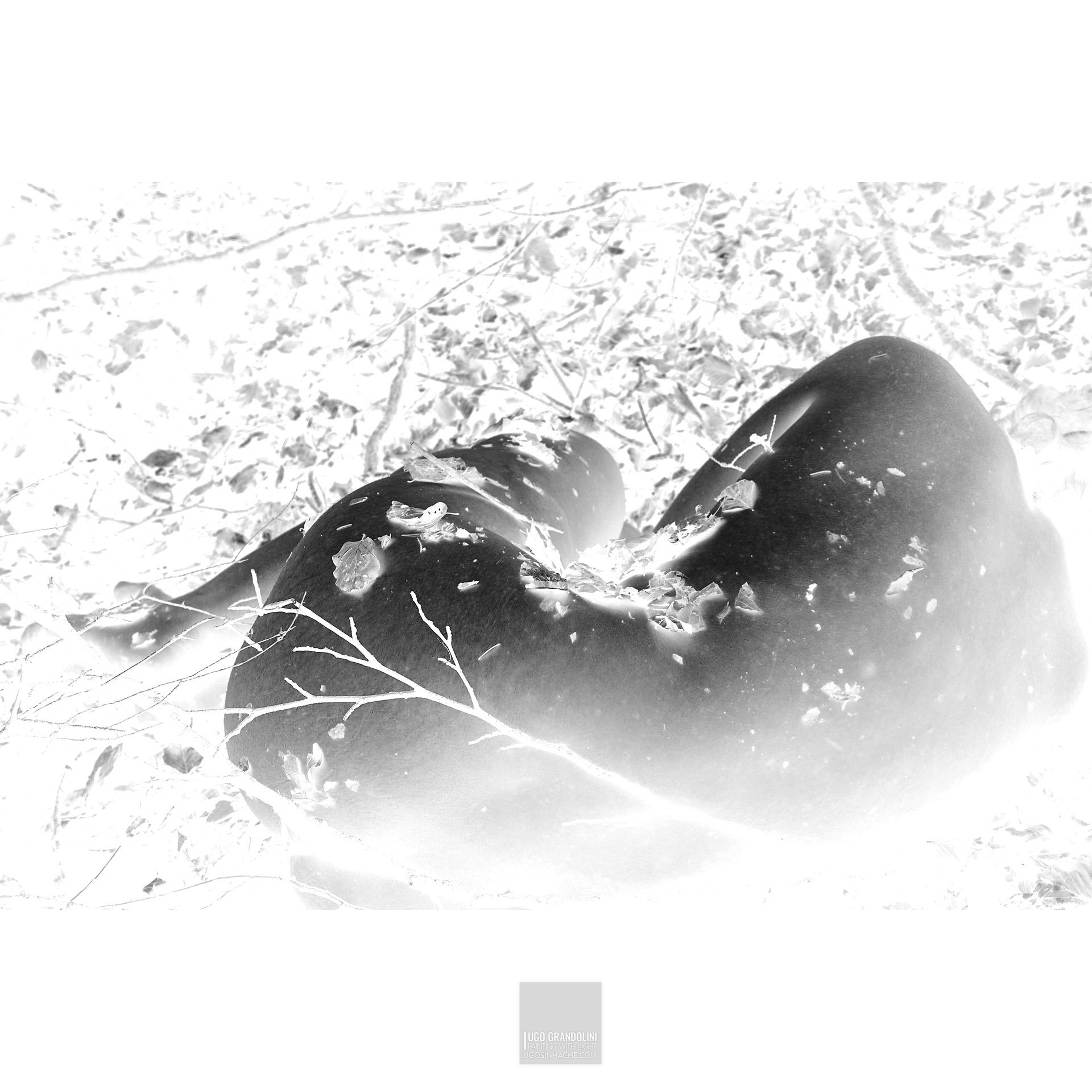 Con i negativi Grandolini esalta ancora di più il dialogo tra luce e ombra, trasformando la natura in una sorgente luminosa e la pelle in un’oscurità profonda. L’idea geniale del negativo diventa una metafora del guardare oltre, nel vedere ciò che normalmente rimane celato.