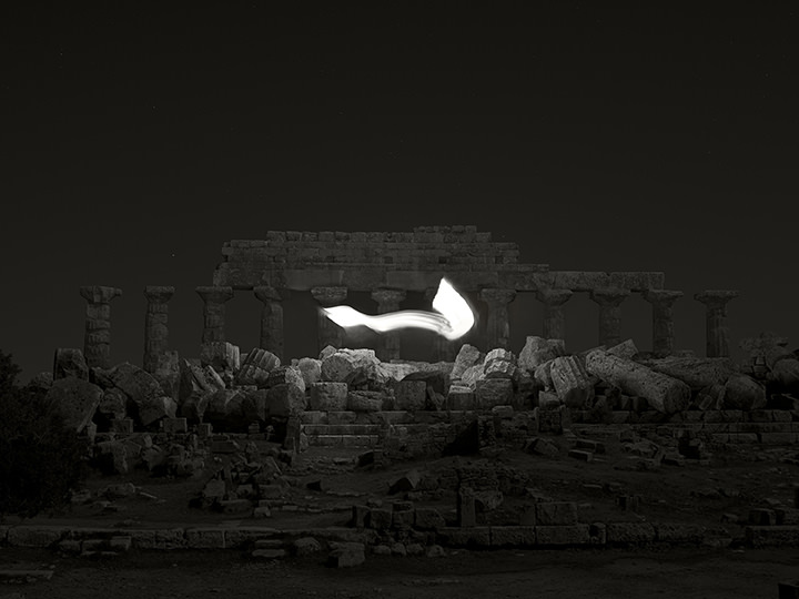 «In Irlanda ho trovato questo – racconta l’artista –: cerchi di pietre nell’erba, castelli in rovina in cima alle scogliere e tuttavia ancora vivi, gigantesche pietre erose dal mare e dal vento. E così in Sicilia, con i suoi templi, con le rocce nere del vulcano, con tutte le sue asprezze. Due isole così lontane e diverse, così ricche di sacralità e mistero. Forti, selvagge. Officium, l’uffizio, è preghiera. È cantare qualcosa di sacro, pregare per i miracoli della vita e della morte, un atto che nella liturgia cristiana rende reale l’amore e la dedizione a Dio. Ma è anche un dovere, un obbligo filosofico e morale verso qualcosa in cui si crede fermamente. Una scelta. È quello che sento quando visito questi luoghi durante le ore della notte. La luce è la mia offerta: il portale che permette il passaggio dal reale a ciò che sta dietro, giusto poco più in là, e che riesco a vedere. È il dovere che ho scelto, il mio uffizio, e, forse, l’unico modo che conosco di pregare.»