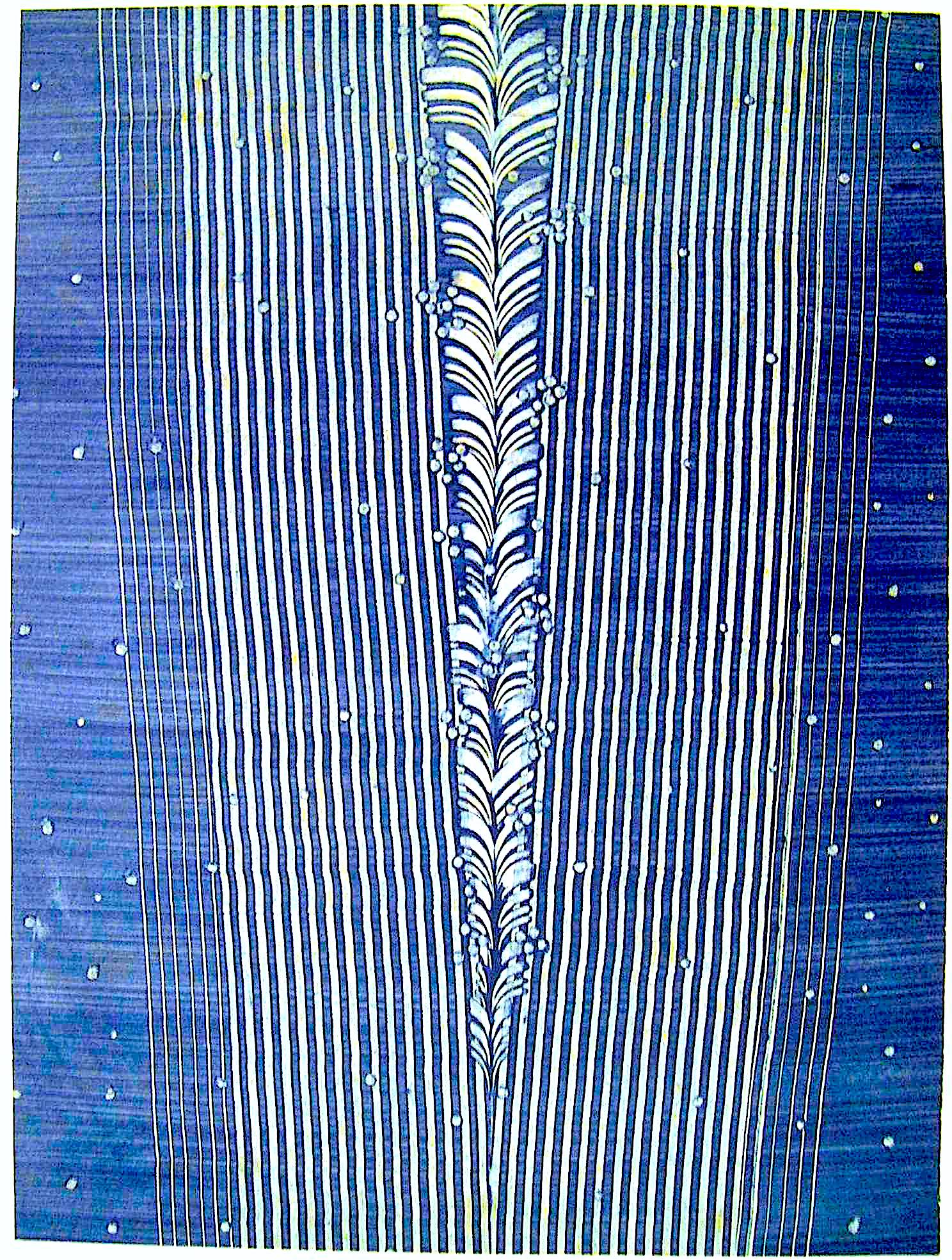 Si tratta di esemplari in copia unica, nei quali si riscontra la complessa armonia tra il rigore metodologico appreso durante gli studi, le conoscenze chimiche e il gusto per la decorazione a tutto campo. I fogli sono da intendere sia come bozzetti preparatori per i progetti in corso, sia come campioni da affiancare agli scritti specialistici di Zovetti sulle carte e sulle tecniche. Tutto il processo è in mano all’artista: dalla preparazione dei supporti, alla combinazione dei pigmenti, fino alla realizzazione stessa degli strumenti di lavoro.
