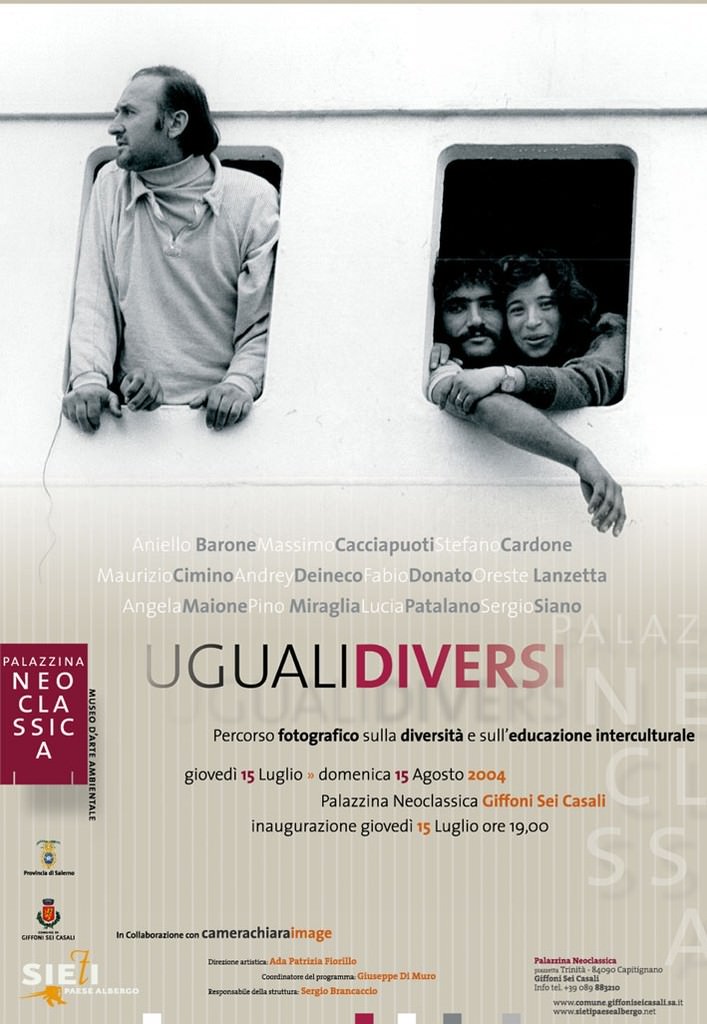 Giovedì 15 luglio alle ore 19 presso la sede della Palazzina Neoclassica di Giffoni Sei Casali sarà inaugurata la mostra fotografica UGUALI/DIVERSI percorso fotografico sulla diversità e sull’educazione interculturale. È un tracciato espositivo comprendente il lavoro di undici fotografi campani corrispondenti ai nomi di Aniello Barone, Massimo Cacciapuoti, Stefano Cardone, Maurizio Cimino, Andrey Deyneco, Fabio Donato, Oreste Lanzetta, Angela Maione, Pino Miraglia, Lucia Patalano, Sergio Siano. Organizzata in collaborazione con “camerachiraimage”, essa nasce, nella formulazione del suo ideatore, Pino Miraglia, come un progetto itinerante, promosso dalla Regione Campania, dalla Provincia e dal Comune di Napoli, oggi accolto nella sede della Palazzina Neoclassica, in linea con il programma di attività espositiva di questa che, a sua volta sostenuto dalla Provincia di Salerno, prevede la creazione, a Giffoni, di un Archivio della Fotografia in Campania.