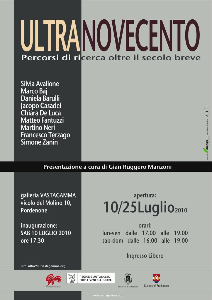 Pordenone tiene a battesimo Ultranovecento, “percorsi di ricerca oltre il secolo breve”. Si aprirà il 10 luglio, alle 17,30 presso la Galleria Vastagamma di via del Molino, la prima di una serie di esposizioni che, nel corso del 2010, toccheranno le principali città del nord Italia. Si tratta di un progetto nato dall'incontro tra arte visiva e poesia e che presenta uno spaccato della nuova generazione di artisti italiani: Silvia Avallone, fresca vincitrice del Campiello opera prima e in corsa per lo Strega, Marco Baj, Daniela Barulli, Jacopo Casadei, Chiara De Luca, Matteo Fantuzzi, Martino Neri, Francesco Terzago e Simone Zanin, poeta pordenonese e ideatore di Ultranovecento.