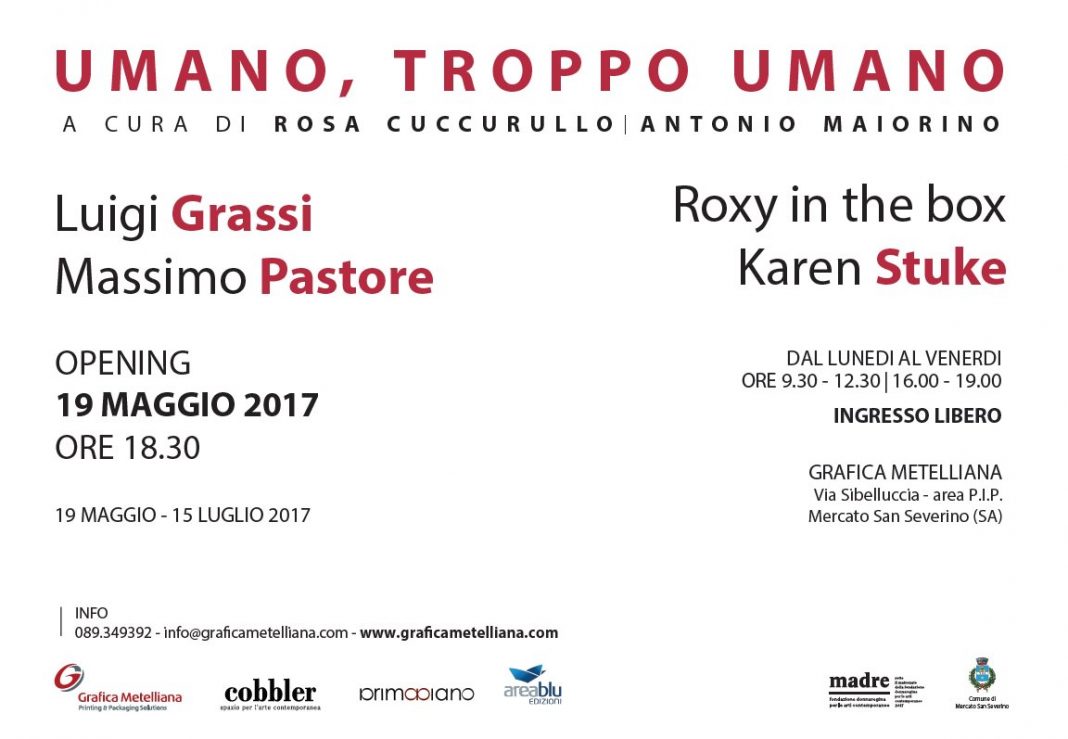 Luigi Grassi, Karen Stuke, Massimo Pastore e Roxy in the box dal 19 maggio al 15 luglio insieme nella mostra “Umano, troppo umano”. La collettiva sarà allestita negli spazi espositivi di Grafica Metelliana, a Mercato San Severino (SA), in collaborazione con Cobbler, spazio per l’arte contemporanea e con la Galleria PrimoPiano di Napoli, con il conferimento del Matronato della Fondazione Donnaregina per le arti contemporanee. L’opening della mostra, curata in forma aforistica da Rosa Cuccurullo e Antonio Maiorino, è previsto per venerdì 19 maggio, alle ore 18.30, in via Sibelluccia (area PIP). Il catalogo è pubblicato da Areablu Edizioni nella Collanadiperle, dedicata ai grandi artisti dell’arte contemporanea.