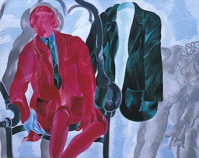 In questi lavori ritornano inoltre alcuni oggetti che caratterizzano i quadri degli anni Sessanta,lavori presenti in mostra solo come richiamo e contrappunto: close up di motociclette, scarpe, abiti maschili, cravatte, segni del mondo moderno che l’artista però sembra sottrarre al ruolo di merce conferendovi un tono lirico e intimo. Così un abito diventa uno spazio, una cravatta e una gruccia sono linee di contorno che delimitano una superficie (una sorta di mise en abime della cornice, una figura del quadro); gli aquiloni sono quell’elemento ambiguo che è oggetto autonomo ma anche elemento del paesaggio; i dépliant moltiplicano il piano del quadro attraverso la rappresentazione.