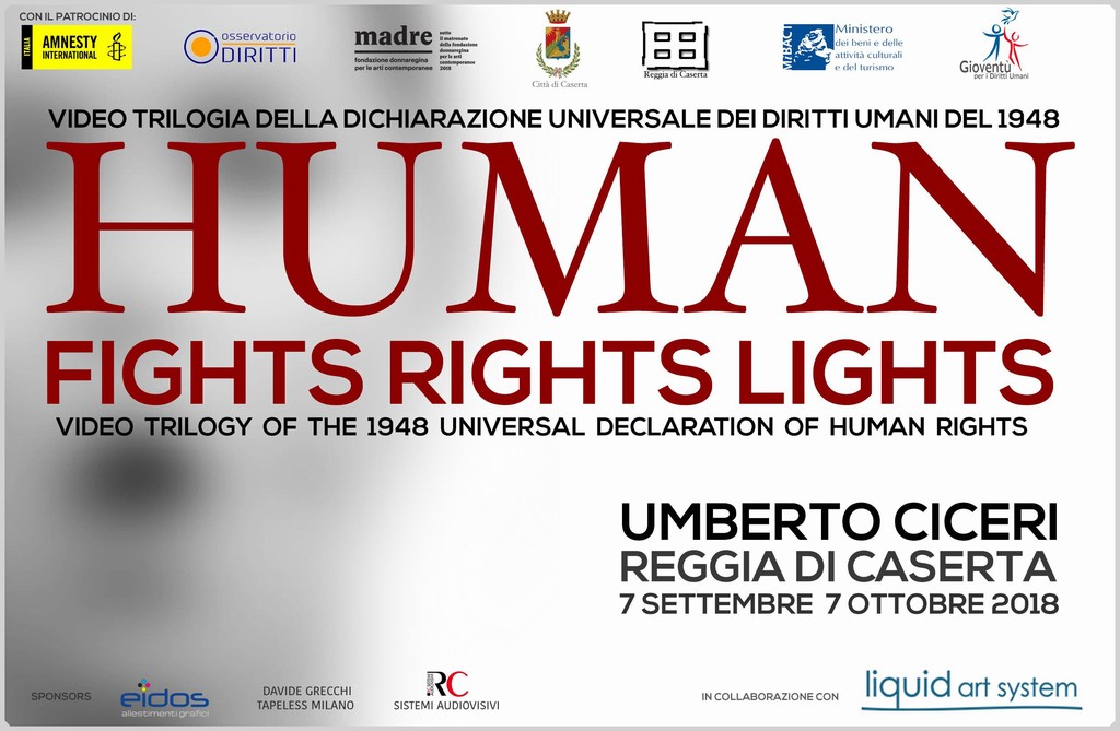 “HUMAN fights rights lights” è il titolo della video trilogia dell’artista Umberto Ciceri che teatralizza il testo integrale della Dichiarazione Universale dei Diritti Umani del 1948, in occasione del suo settantesimo anniversario, attraverso l’ambiguità etica ed estetica del linguaggio mediatico adottato.