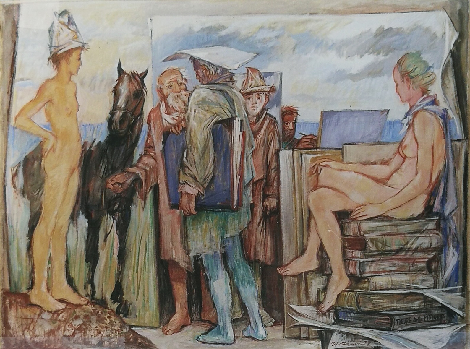 La nostalgia per le grandi composizioni con figure è rappresentata dall’affresco di Arcumeggia eseguito con quella adesione alla antica tecnica che gli permetterà di resistere a lungo. Quindi, da altre composizioni con figure tra cui un “arazzo dipinto” ricco delle raffigurazioni decorative tipiche dello storico genere.