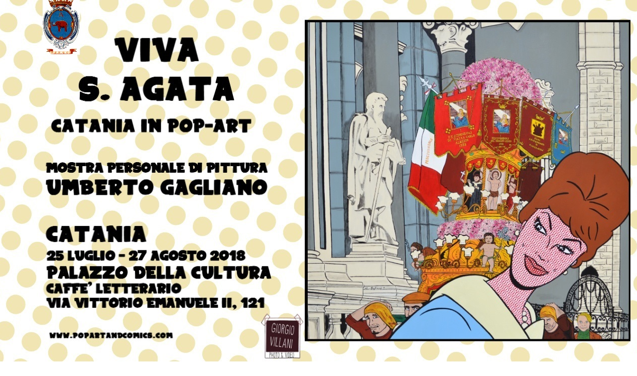 Mercoledì 25 luglio alle ore 18,00 al Palazzo della Cultura via Vittorio Emanuele 121 Catania, il Sindaco Salvo Pogliese alla presenza di autorità cittadine, inaugureranno la mostra “VIVA SANT’AGATA - CATANIA IN POP ART” di Umberto Gagliano.