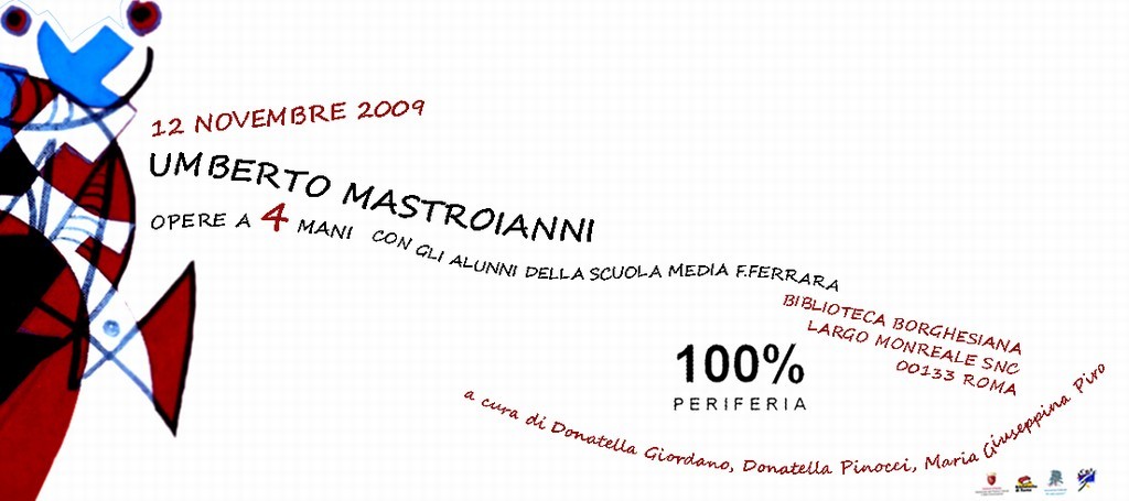 Per il nostro prossimo evento abbiamo coinvolto l'Associazione culturale "Il cedro azzurro", che già in passato, sempre alla Biblioteca Borghesiana, aveva organizzato una mostra su Mastroianni, a cura di Floriano De Santi, pubblicando un catalogo che si presentava con una prefazione dal titolo "Una mostra internazionale in periferia" scritta da Colombo Mattei, il Presidente dell'Associazione "il Cedro Azzurro":