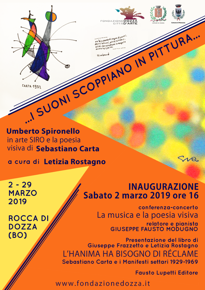 La mostra, allestita nelle sale espositive della Rocca Sforzesca di Dozza, organizzata dalla Fondazione Dozza Città d’Arte e curata da Letizia Rostagno, vede protagonisti due artisti accomunati da una sincera amicizia oltreché da un percorso artistico che li vede entrambi muovere i primi passi in ambito futurista. Gli esiti di questo imprinting saranno diversi eppure curiosamente simili per tutti e due e, fatti gli opportuni distinguo di tecnica e linguaggio, li condurranno negli anni ’60-70 a produrre opere nelle quali appare evidente la continuità tra Futurismo e Poesia visiva nel nome della contaminazione parola-suono-immagine.