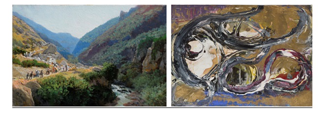 La mostra “Un bisogno ossessionante di cosmo”. Dal Piemonte verso l’Europa: la pittura di Pietro Sassi e Pinot Gallizio si configura pertanto come un percorso costruito su due binari paralleli, lungo i quali, si snodano due significativi percorsi artistici. Da un lato, la pittura ad olio, protesa alla ricerca di soluzioni formali che esaltino i raccordi formali del paesaggio, adottata da Pietro Sassi, si squaderna nella serie di impressioni dal vero eseguite nella città eterna, dove nel 1875 il pittore di Alessandria si trasferisce definitivamente. Dall’altro, le resine plastiche, i pigmenti metallici, le tempere grasse, sismografi del vorticoso ductus pittorico delle opere di Gallizio realizzate nei primi anni Sessanta, rivelano, come scrisse la grande critica d’arte Carla Lonzi, “un bisogno ossessionate di cosmo”. La stessa ricerca di infinito che anima le vedute di una “Roma sparita”, quella dipinta da Pietro Sassi dalla terrazza del suo studio, dal cuore dei monumenti di età imperiale, dagli scorci ariosi e sconfinati della periferia cittadina e della campagna laziale.